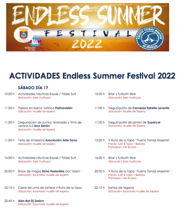 El Puerto Tomás Maestre organiza esta 'fiesta sinfin' del verano' con salidas gratuitas en barco, feria de artesanía, degustaciones y ruta de la tapa con sorteos, además de las actuaciones del mago Ximo y Alexbot DJ Sesion, siendo la jornada de puertas abiertas para usuarios y visitantes.