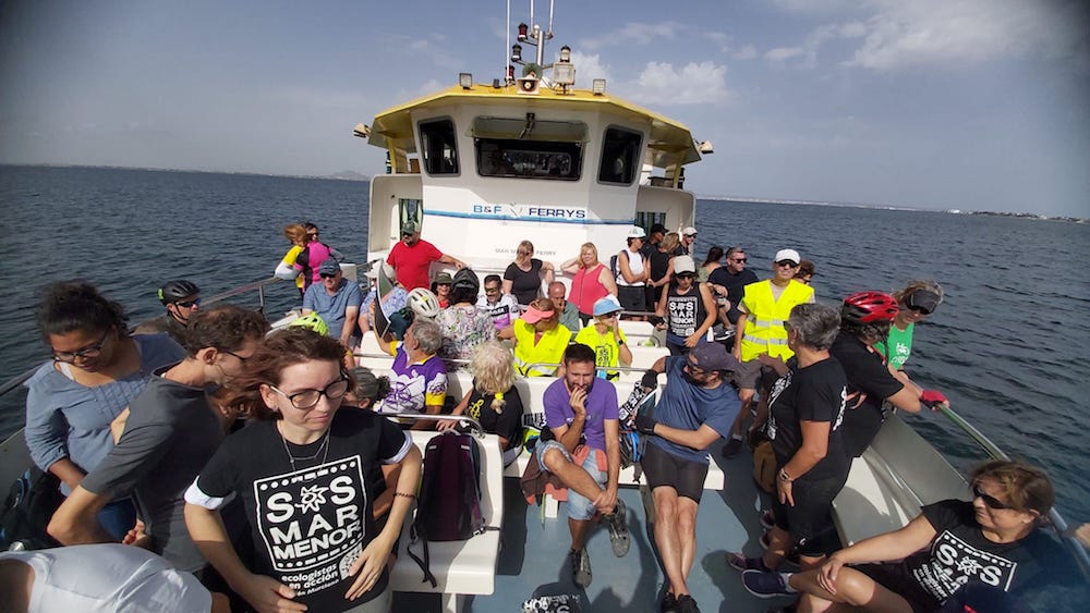 La primera etapa, desarrollada durante el sábado 8 de octubre, el pelotón tomó el ferry regular en Santiago de la Ribera, para viajar hasta el Puerto Tomás Maestre en La Manga, e iniciar la ruta con una explicación general de la laguna salada y su problemática ambiental, destacando el papel del dragado del Canal del Estacio en la reducción de salinidad y la entrada de especies ajenas al ecosistema.