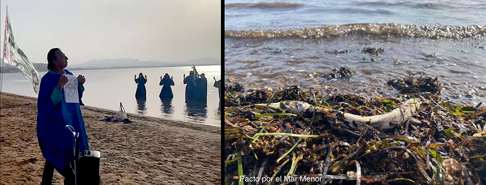 La escena corresponde a anoche en la playa del Espejo, en Los Alcázares, y también se dio en otros puntos de la costa de la albufera para lamentar el nuevo episodio de miles de especies marinas muertas que se ha producido. Esta mañana, a las once, se llevará a cabo una perfomance contra el ecocidio convocada por el movimiento SOS Mar Menor en una jornada en la que se han vuelto a ver más cadáveres en las playas.