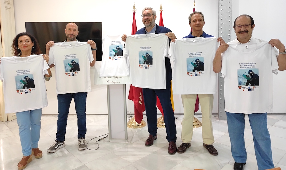 La iniciativa de la Federación de Actividades Subacuáticas de la Región de Murcia se llevará a cabo este próximo sábado en diversos puntos de la Costa Cálida, como La Manga, Cabo de Palos, Isla Plana y, La Azohía. Participan 18 centros de buceo, 40 barcos y se han inscrito unos quinientos buceadores. En la primera edición se recogieron 2.900 kilos de basura marina a lo largo de casi 11 kilómetros de costa. La imagen muestra el acto de presentación de la jornada.