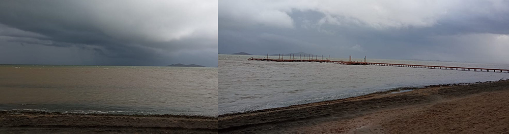 Aspecto de la querida albufera cerca de la playa de Los Urrutias sobre las nueve de la mañana, después de la lluvia caída a primera hora de la mañana en el municipio.