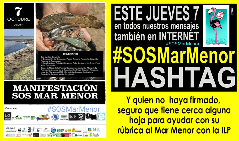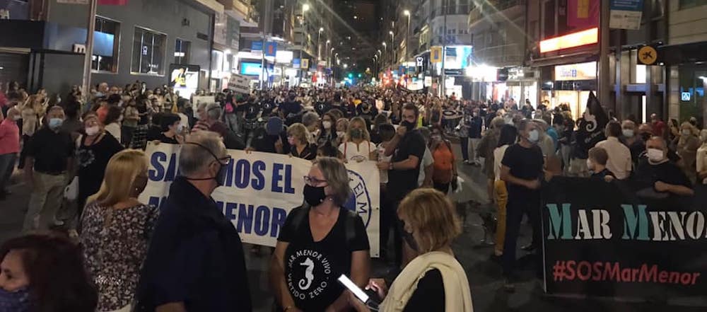 Diversas organizaciones han convocado una gran manifestación en defensa del Mar Menor este 7 de octubre, a las 20 horas, en la ciudad de Murcia, en la que estarán presentes voluntarios de la ONG ambientalista. Los convocantes quieren señalar la mala gestión llevada a cabo por el ejecutivo regional en las más de dos décadas que ha tenido la mayoría de competencias y responsabilidad sobre la laguna salada.
