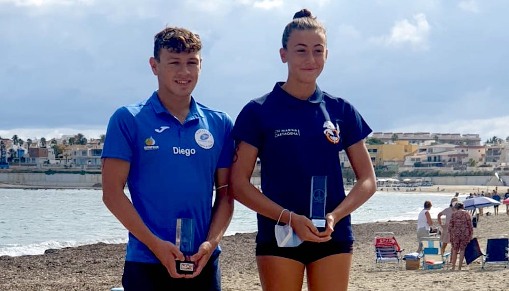 La nadadora de Los Dolores, quien pertenece al club Natación Marina Cartagena Ancora y que recientemente logró en Málaga el título de la Copa de España infantil en aguas abiertas, ha vencido en la prueba de su categoría de féminas de la 'Timoncap' celebrada en Cabo de Palos, que ha tenido a Diego de la Fuente Alonso como ganador masculino. En la imagen adjunta se observa a ambos con sus respectivos trofeos. En júnior femenino la ganadora ha sido Diana Serantes.