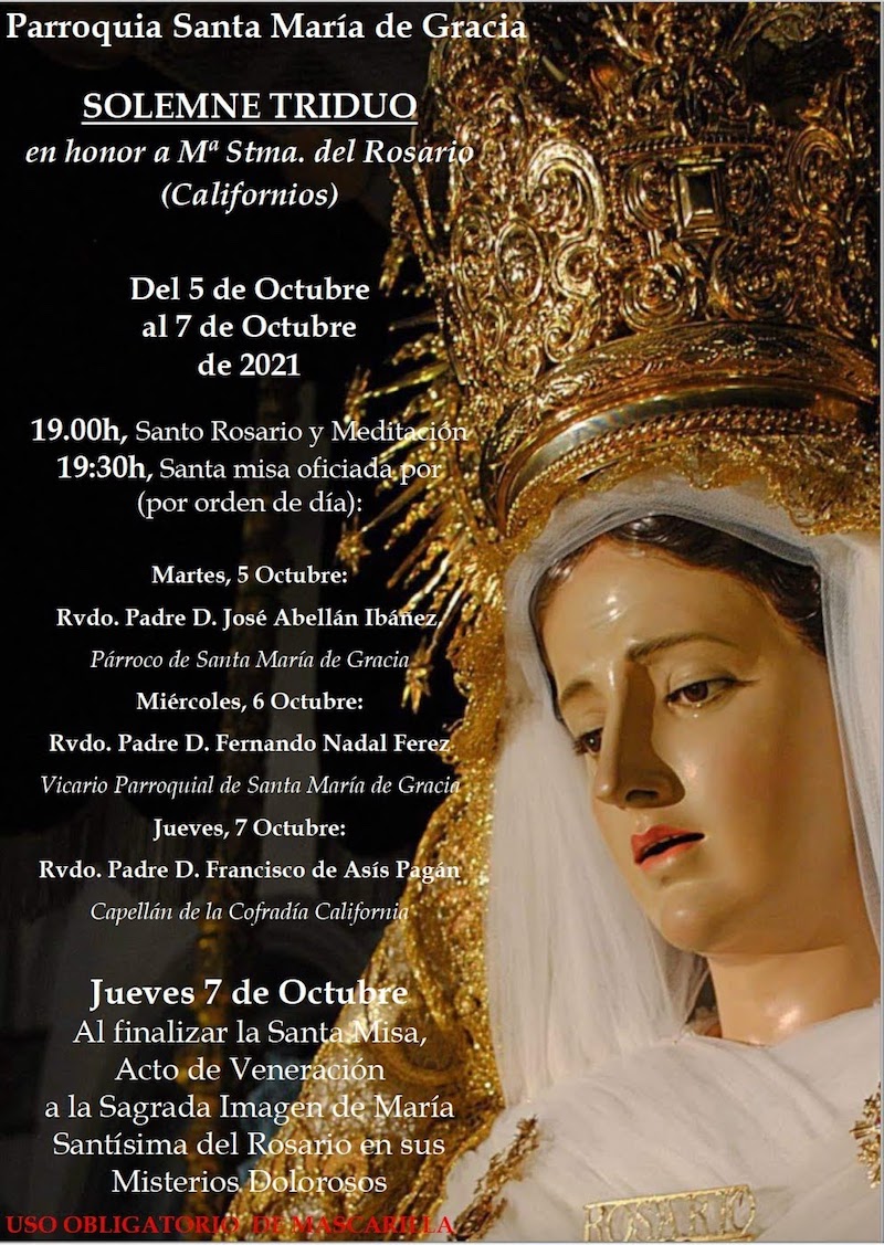 Los actos en honor a María Santísima del Rosario se llevarán a cabo en la parroquia de Santa María de Gracia con eucaristías días oficiadas por los sacerdotes José Abellán, Fernando Nadal y Francisco de Asís, culminando el jueves con el acto de veneración a la imagen.