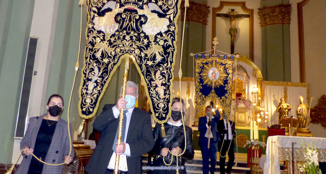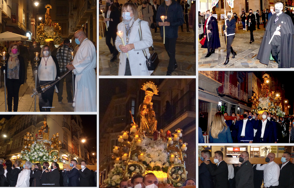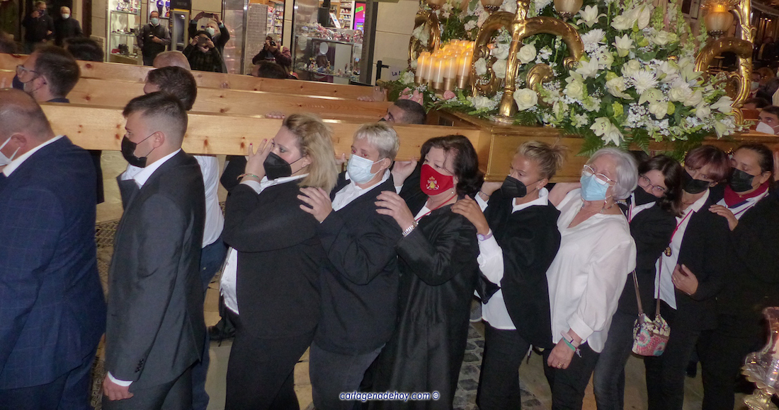 La patrona más antigua de Cartagena, tras la celebración de una eucaristía, volvió a salir en procesión (esta vez en rogativa por el pleno cese de la pandemida) dentro de un cortejo con similar protagonismo para hombres y mujeres, incluidos el grupo mixto de portapasos y los tres capataces, que fueron José Antonio Gómez, Matilde Padín y Fernando Morata, a quienes se observa en la fotografía superior.