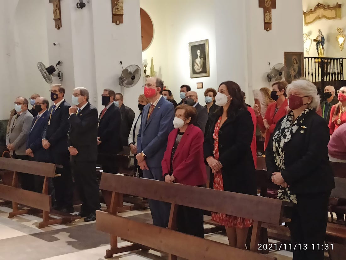 El grupo de cofrades de Cehegín, encabezados por su Presidente, Francisco Corbalán Vélez, y por la Cabo de Andas del paso de San Pedro, perteneciente a esta Cofradía, Magdalena Fernández Abril, asistieron en primer lugar a la 'Eucaristía de Acción de Gracias' que fue presidida por el Capellán Mayor, Rvdo. Padre D. Francisco Muñoz, quien es su homilía dedicó unas cariñosas palabras a los cofrades de Cehegín, en las que destacó las actuaciones realizadas por esta Cofradía a favor de la igualdad.