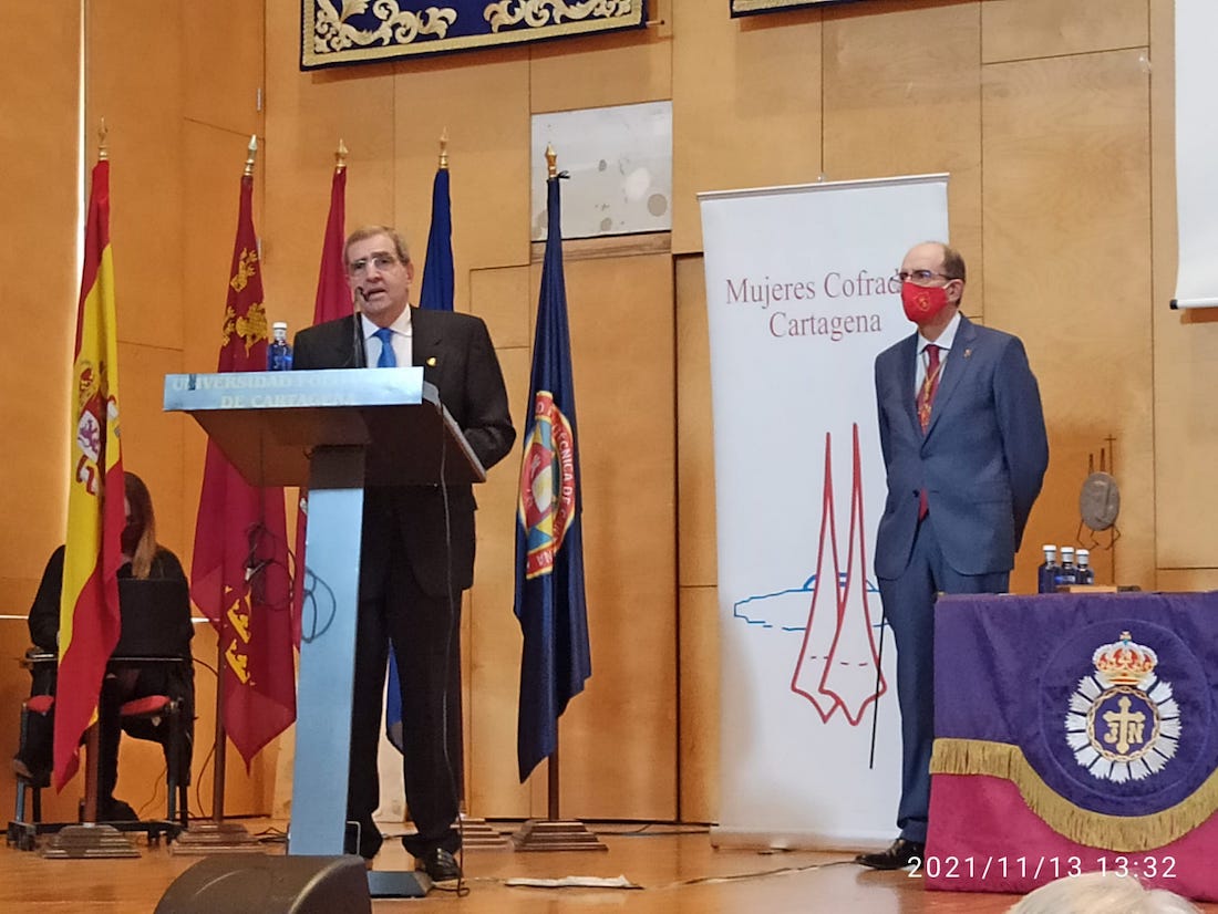 Posteriormente el Paraninfo del Campus Universitario Muralla del Mar, de la Universidad Politécnica de Cartagena, acogía, a las 13,00 horas, la celebración de la Gala de Entrega del Premio PASOS en la que se rindió homenaje a la Cofradía de la Preciosísima Sangre de Cristo, ganadora de la edición 2021 de este galardón.