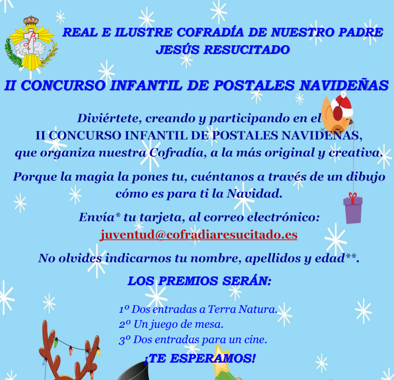 La Real e Ilustre Cofradía de Nuestro Padre Jesús Resucitado convoca el II Concurso de Postales Navideñas, con el objetivo de fomentar la participación, los valores y la expresión artística de nuestras tradiciones entre los más pequeños y jóvenes de la Cofradía.