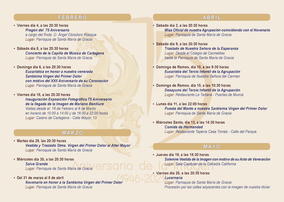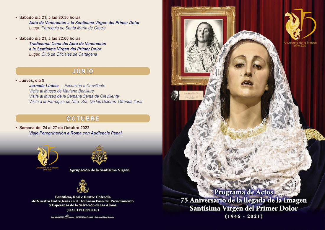 La ‘madre’ de los californios, salvo contratiempos, volverá a ‘pasear’ por la ciudad el Miércoles Santo (13 de abril) y volverá a hacerlo con la ‘Lucernaria’ del 20 de mayo. Los actos del 75 aniversario de la llegada a Cartagena de la imagen creada por el escultor Mariano Belliure (foto adjunta) se prolongarán hasta octubre, pues se incluye el viaje peregrinación a Roma con audiencia papal.