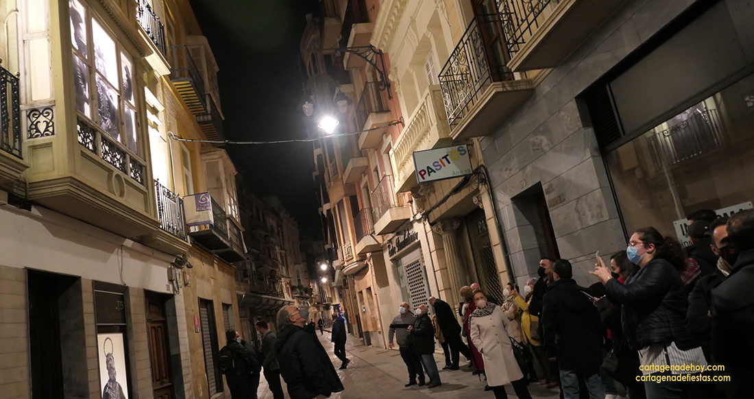 En la misma calle de Aire, muy cerca de donde fueron quemadas (frente a la iglesia de Santa María en 1936, en el inicio de la Guerra Civil), las imágenes de siete obras que creó el gran imaginero Francisco Salzillo y una de su discípulo Roque López (San Pedro) vuelven a ser contempladas desde las calles del casco urbano de la ciudad, lugar por el que desfilaron en procesión en los primeros años de la hermanad de Cristo en el Paso del Prendimiento, consitituida en 1747 y que ahora inicia los actos de su 275 aniversario con esta exposición denominada ‘Como era en un principio’, en la que los viadantes pueden contemplar cómo eran aquellas tallas de la Virgen del Primer Dolor, la Samaritana y San Juan, según las que se observan en lo más alto de la fachada; Jesús y el ángel de la ‘Oración del huerto’, Cristo del Prendimiento y el Ósculo, en el primer piso; y San Pedro y Santiago, a pie de calle.
