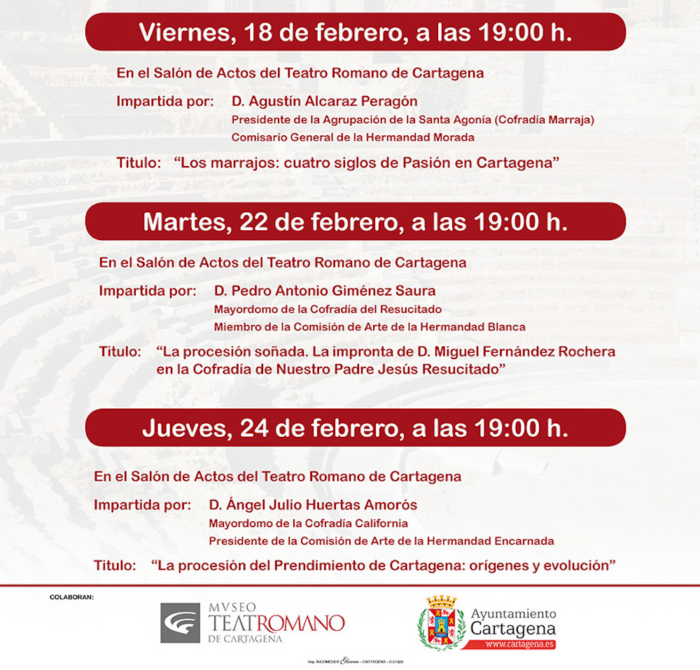La asociación cultural, que preside Fulgencio Sevilla, comienza el viernes 18, con el presidente de la agrupación de la Santa Agonía, Agustín Alcaraz Peragón, esta iniciativa centrada en las procesiones de la Semana Santa de Cartagena. El título de la jornada de hoy es ‘Los marrajos: cuatro siglos de pasión en Cartagena?. Los días 22 y 24 de este mes los protagonistas serán representantes de las hermandades del Resucitado y del Prendimiento.