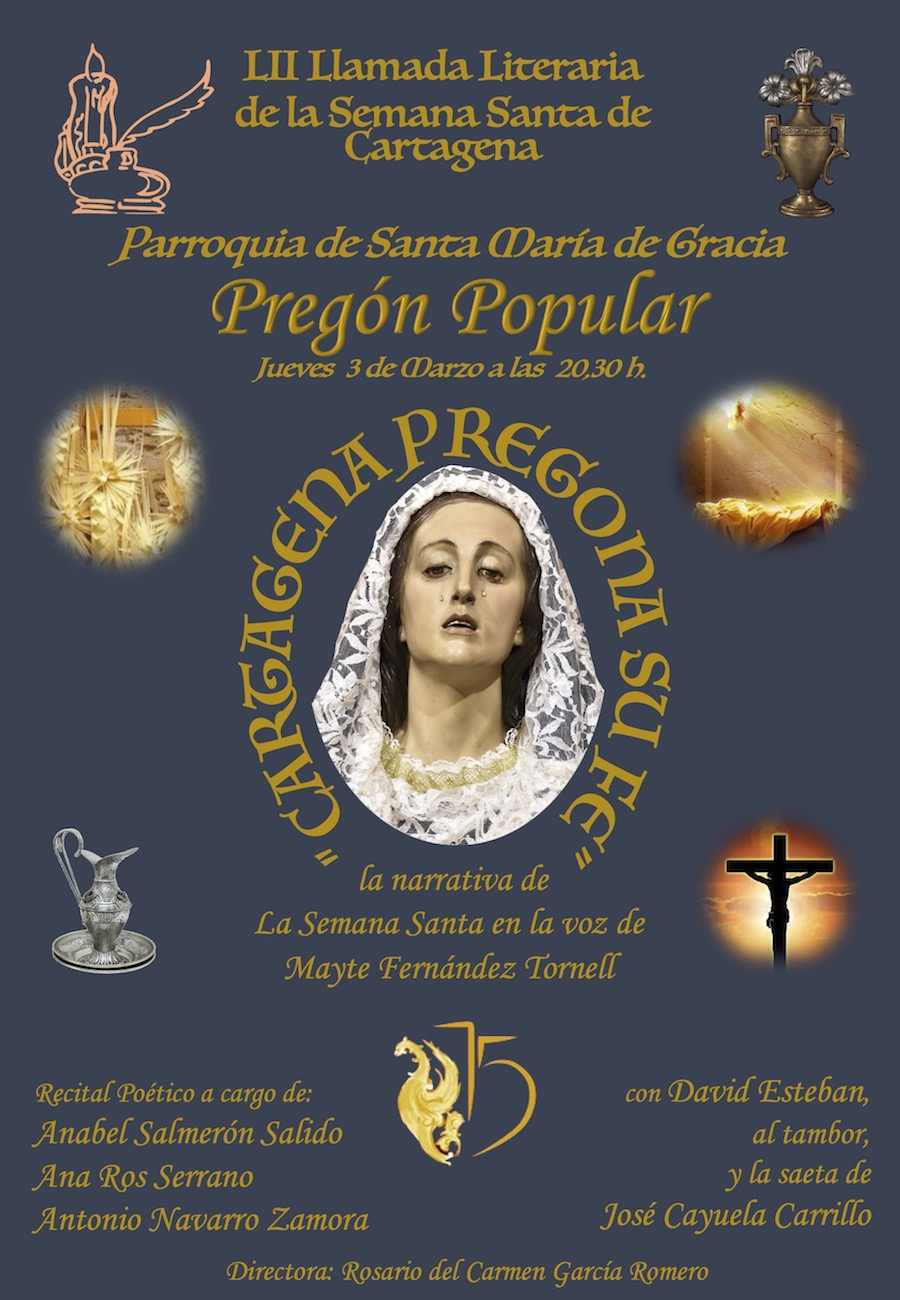 Dos días después de la popular ‘llamada de la Semana Santa de Cartagena’, tendrá lugar en la iglesia de Santa María la 52 edición de este tradicional acto que, bajo la dirección de Rosario del Carmen García (en la foto adjunta durante la edición del pasado año), incluye recital poético a cargo de Anabel Salmerón, Ana Ros y Antonio Navarro, con David Esteban al tambor y la saeta de José Cayuela Carrillo, y que abre, bajo el título de ‘Cartagena pregona su fe’, el pregón popular a cargo de Mayte Fernández Tornell.