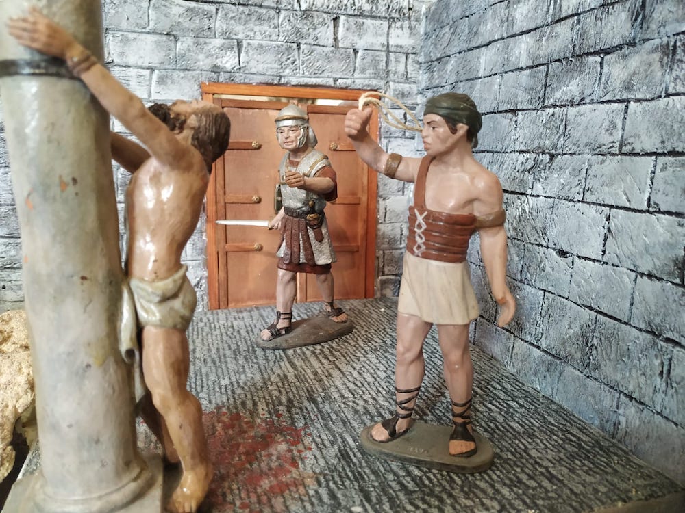 Todo el montaje se despliega donde habitualmente se coloca el Belén de Navidad, con unas cien figuras de barro hechas en miniatura, de diferentes artesanos belenistas como Jose Luis Mayo, Galán, Griñan y Carlos Cuenca, que representan la vida, pasión, muerte y resurrección de Cristo e incluyen diferentes momentos de la vida del Señor, desde su Bautismo hasta su Resurrección.