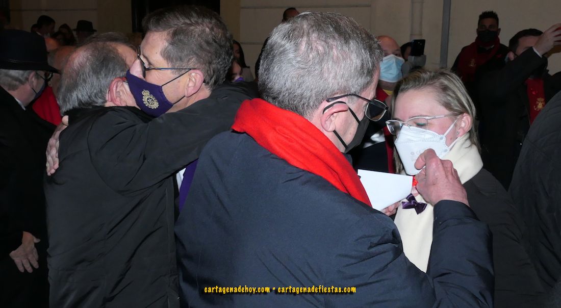 A las ocho y tres minutos se inicia la recogida desde la calle Palas con los sones de ‘Micaela’ que ofrece la agrupación musical Cartagena 1990 en cabeza de la comitiva, figurando al frente el ‘incombustible’ marrajo Tomás del Pozo. La primera escala estaba ante la sede marraja, donde la banda de música se ha detenido y girado para tocar una pieza dedicada a los comisarios de esta cofradía. La idea era hacer lo mismo en las siguientes, pero no ha podido ser para no alterar el horario de llegada al Palacio Consistorial. Se han sucedido los encuentros-recogida entre los cofrades de los distintos colores pasionarios, con imposición de alfileres. Después, juntos se han dirigido hacia la sede municipal, variando en esta ocasión el recorrido al completarse la calle del Aire y evitarse la calle Mayor para una mayor seguridad sanitaria ante la aglomeración de personas.