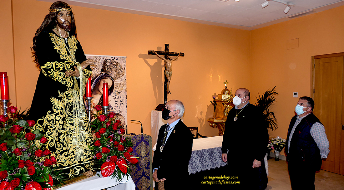 La Asociación Canónica del Cristo de la Divina Misercordia ha solicitado al Ayuntamiento de Cartagena variar el trayecto del vía crucis del Viernes de Dolores para evitar pasos complicados (como el de la calle San Vicente) y facilitar una más cómoda presencia de las personas que integran el cortejo, que cada año son más. La petición es adentrarse por Puerta de Murcia y calle Santa Florentina. La imagen muestra a la imagen en la jornada de devoción al público que tuvo lugar el viernes en la capilla provisional de la basílica menor de la Virgen de la Caridad.