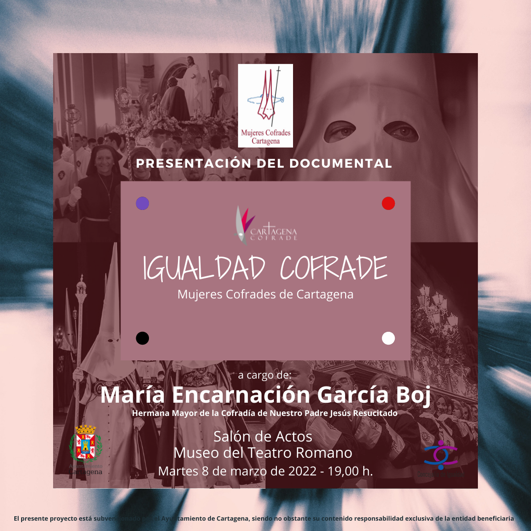 La Asociación Mujeres Cofrades de Cartagena ha producido un documental sobre la igualdad en las cofradías cartageneras. La presentación de 'Igualdad Cofrade', como se denomina el trabajo, será a las 19 horas en el Salón de Actos del Museo del Teatro Romano.