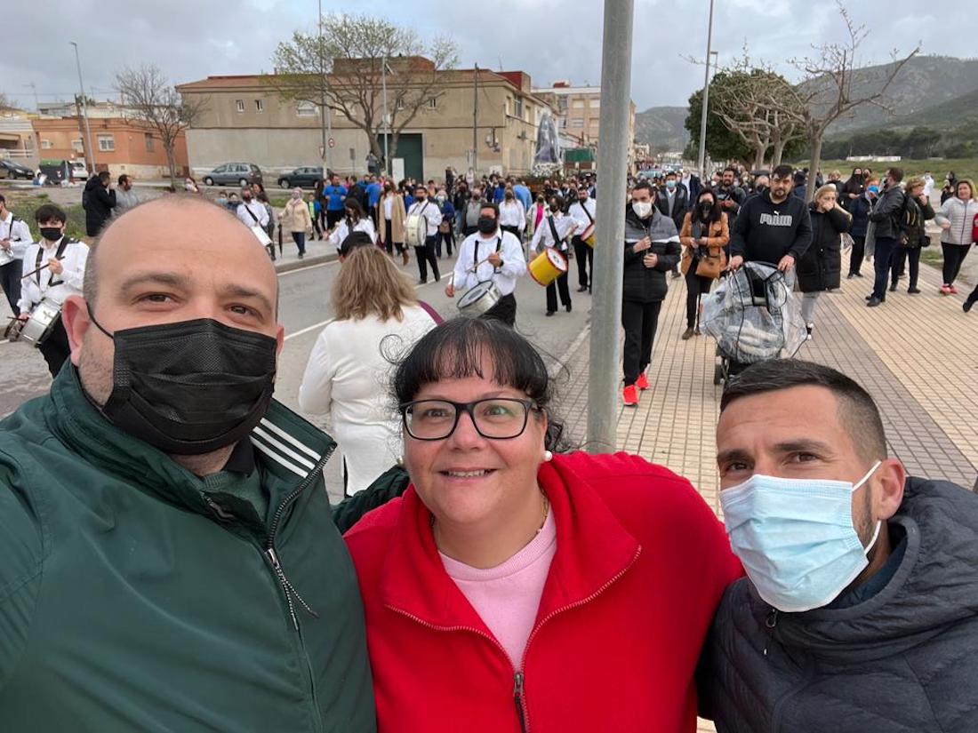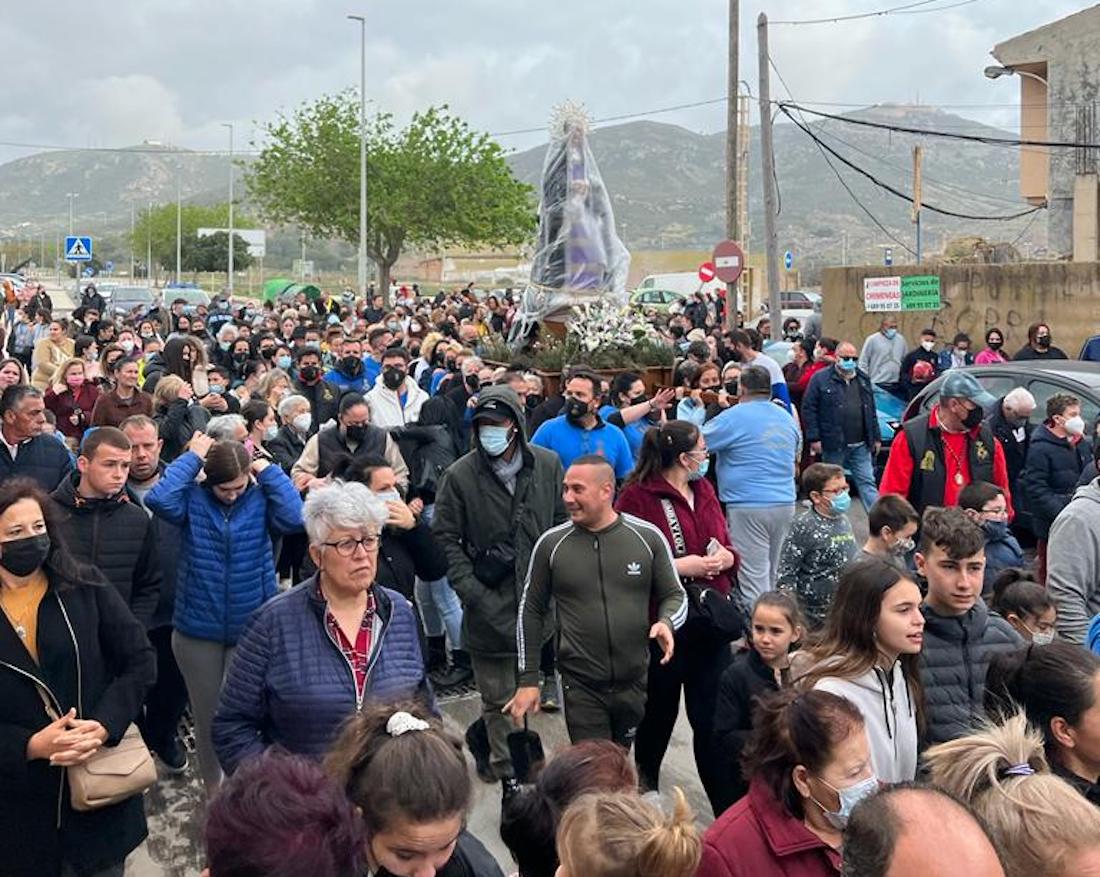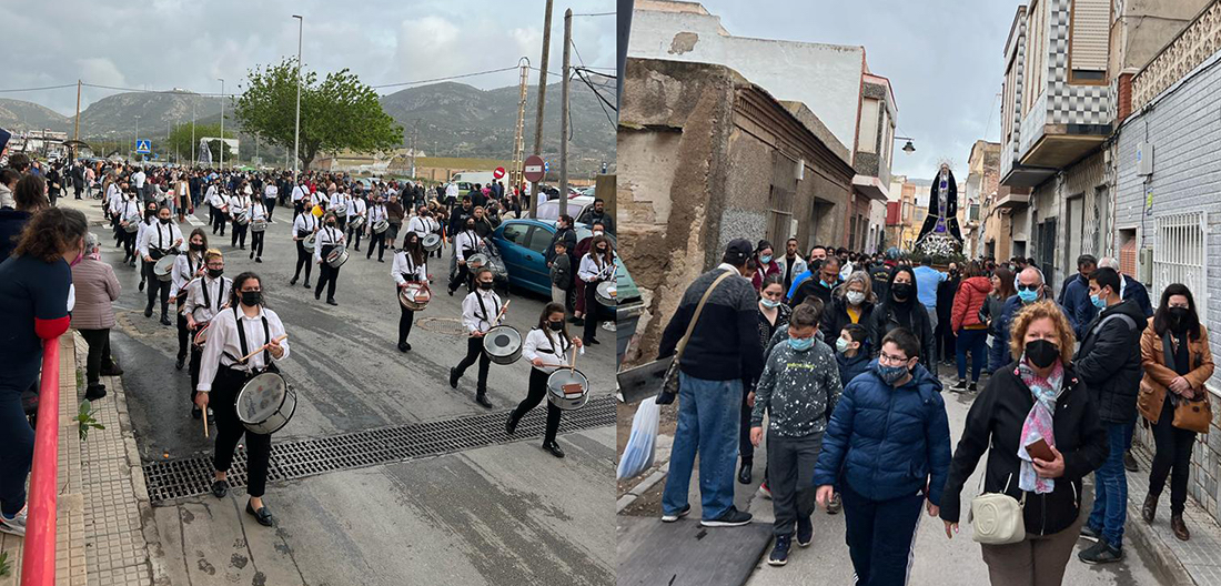 Numerosos fieles han acompañado esta tarde a la Soledad desde su ermita hasta la parroquia de Santa Lucía, en una romería que no tenía lugar desde 2019 y cuyo paso abrían el estandarte y la banda de música.