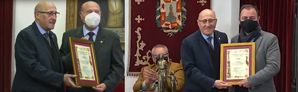 La asociación cultural entregó cuadros de felicitación expresa a las agrupaciones californias de San Juan Evangelista, Ósculo y Cristo de la Flagelación, que este año celebran su 75 cumpleaños, siendo recogidos por sus respectivos presidentes, Antonio José Martínez Monerri, Rafael Ruiz Manteca y Pedro Ayala Gallego, a quien se observa en la imagen adjunta junto a Pedro Negroles, presidente del colectivo que ha entregado estas distinciones.