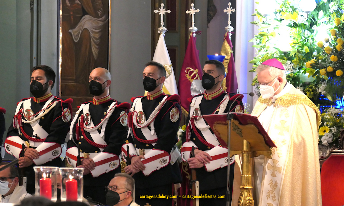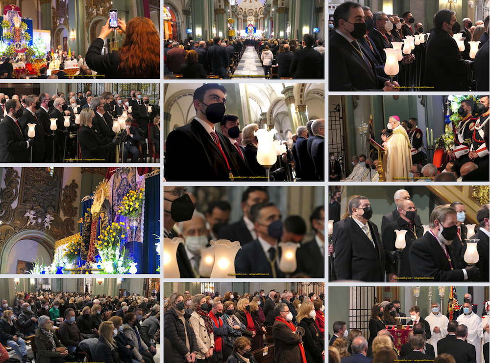 La Cofradía California ha celebrado en una abarrotada Santa María su principal acto litúrgico de cuaresma dedicado a la Virgen del Primer Dolor, que ha sido concelebrada por varios sacerdotes, con el obispo de la diócesis de Cartagena, José Manuel Lorca Planes presidiendo. En su homilia, ha pedido a los presentes mirar a María, “pues en ella vemos la ternura y el cariño de los fuertes, no de los débiles”, ha dicho, añadiendo más tarde que ella “fue madre, discípula y maestra en la oración; es fuente de esperanza y alegría”, reiterando varias veces la siguiente petición: “Madre, regálanos tu mirada”, matizando que su mirada “no se compra, es un regalo que nos hace más hermanos y solidarios”.
