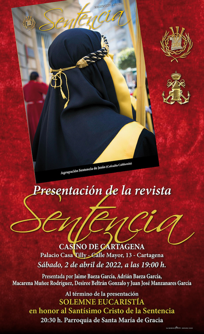 Mañana sábado 2 de Abril a las 19:00 horas en el Casino de Cartagena, calle del Mayor, tendrá lugar la presentación de la vigésimo quinta edición de la revista 'Sentencia', a cargo de cuatro jóvenes fundadores del tercio infantil; D. Jaime Baeza Garcia, D. Adrian Baeza Garcia, Dª. Macarena Muñoz Rodriguez, D. Juan Jose Manzanares Garcia y la Responsable de Juventud de la Agrupación Dª. Desiree Beltran Gonzalo.