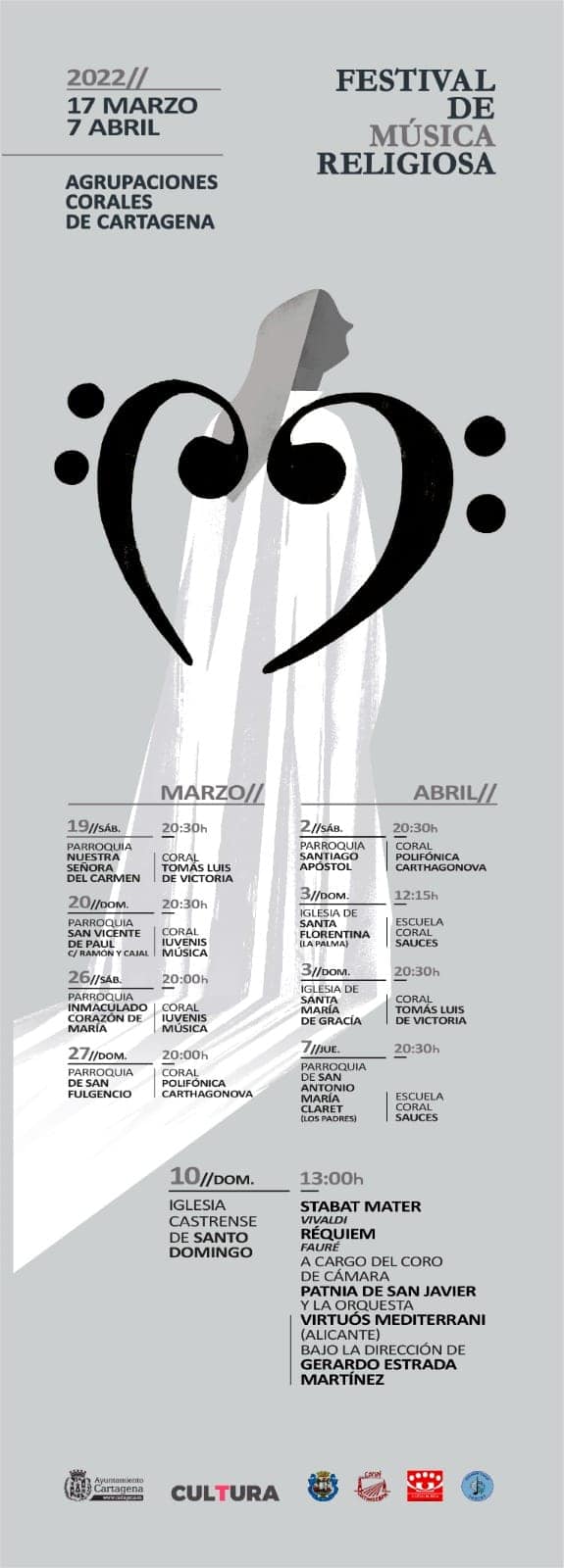 El Festival de Música Religiosa, que arrancó el pasado 19 de marzo, llega a su fin con las última actuaciones de este jueves y del domingo. El festival, organizado por las agrupaciones corales de Cartagena, ofrecerá el jueves un concierto en la Parroquia San Antonio María Claret (Los Padres) a las 20:30 horas, de la mano de la escuela coral 'Sauces'. Por último, el broche final tendrá lugar el domingo 10 de abril a las 13:00 horas en la Iglesia Castrense de Santo Domingo.