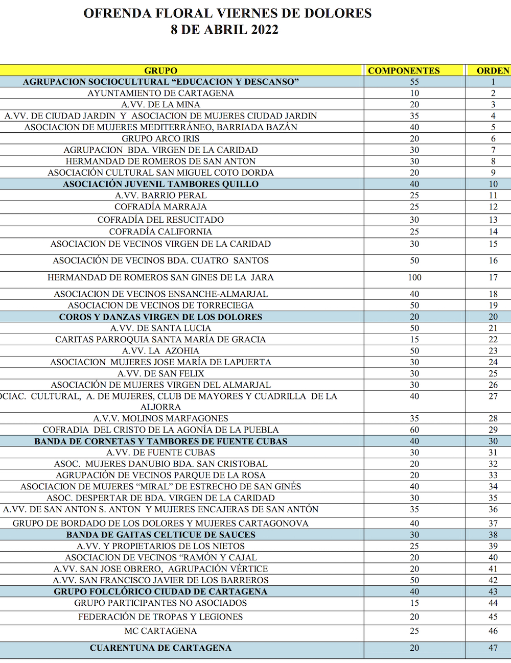 ➡️ 17.00 horas. Inicio en la plaza del Ayuntamiento del desfile de asociaciones de Cartagena con destino a la Basílica de la Caridad, donde llevarán a cabo la multitudinaria ofrenda floral.