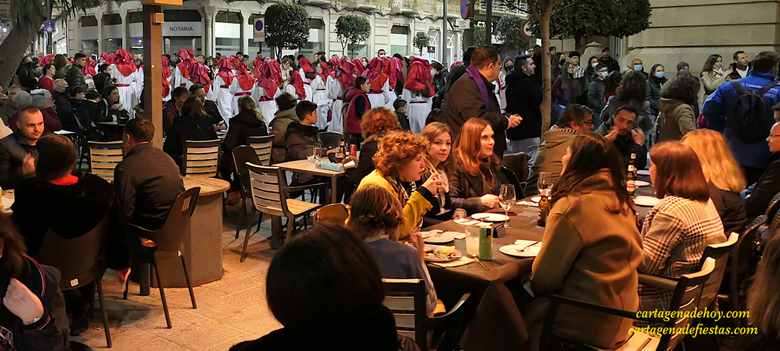 La Semana Santa de Cartagena ha llegado a su ecuador y los establecimientos de hostelería del casco antiguo no se pueden quejar, pues en los locales ubicados al paso de las procesiones y en su entorno más cercanos ha sido muy visible la masiva presencia de clientes desde el pasado Viernes de Dolores y hasta el Martes Santo. Hoy hay amenaza de lluvia, pero después llegarán los días más fuertes (es cuando más turistas llegarán) de estas fechas.