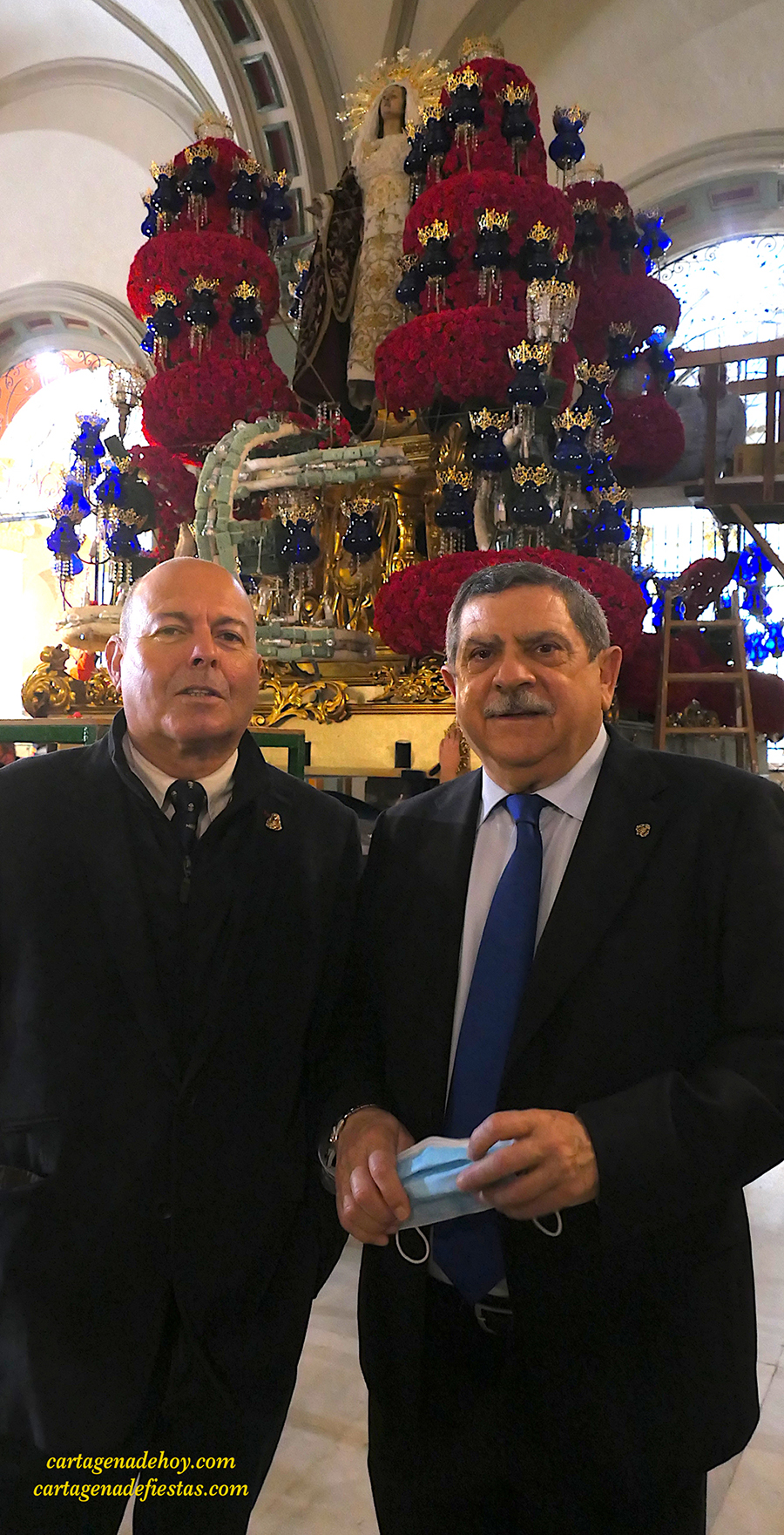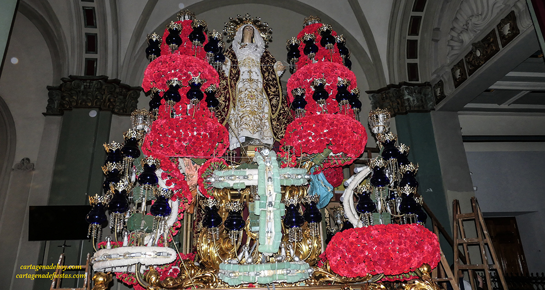 La madre de los californios, con motivo del 75 aniversario de la llegada a Cartagena de la imagen que creó el artista Mariano Benlliure, ha llevado a cabo un adorno floral encarnado hoy en el trono, lo que no tenía lugar desde hace unos treinta años (en ese tiempo las flores eran blancas) como iniciativa excepcional en recuerdo a cómo iba cuando llegó a esta tierra hace tres cuartos de siglo.