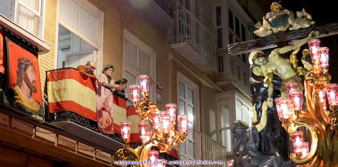 Sigue el cortejo con la Virgen de la Piedad con el cuerpo sin vida de su hijo y el Santo Entierro, grupo creado por González Moreno que será la imagen del cartel de la Semana Santa de Cartagena de 2023.