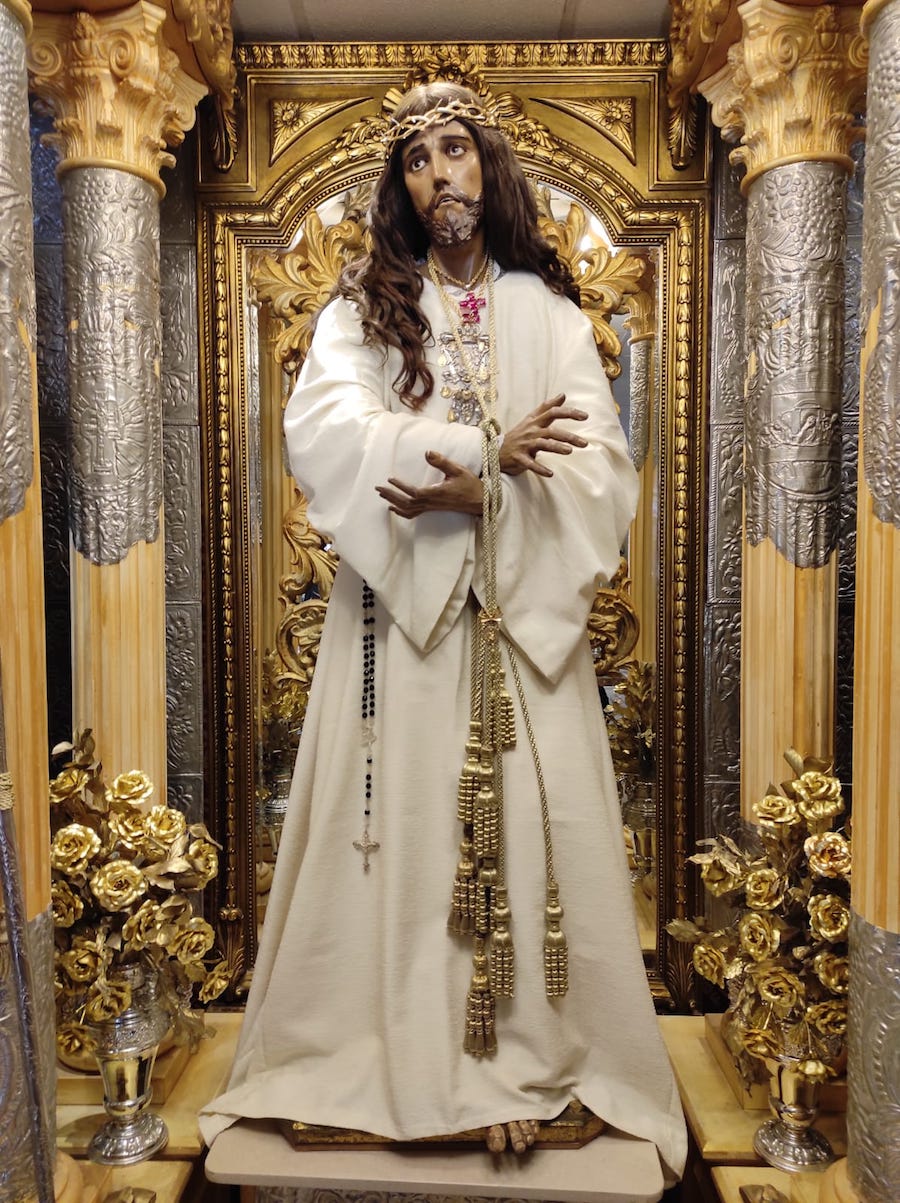 Para tan importante celebración de la Misericordia Divina, la talla del Cristo atribuida al escultor Francisco Salzillo, ha sido vestido con una túnica de color blanco roto de raso salvaje, donada por Manolo, el anticuario de la calle Caballero.