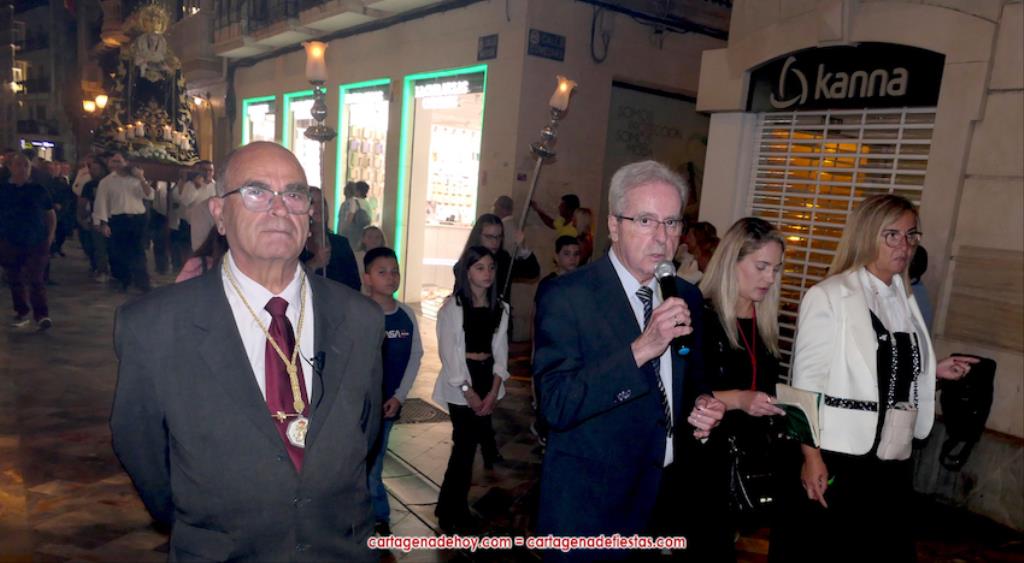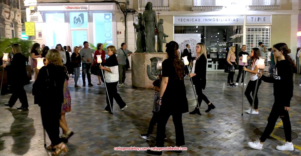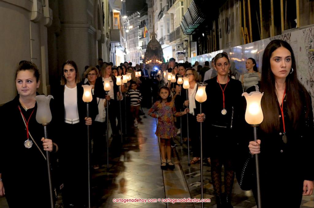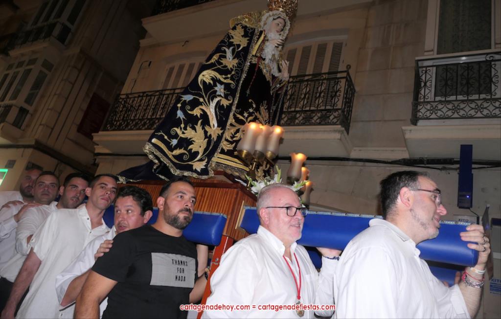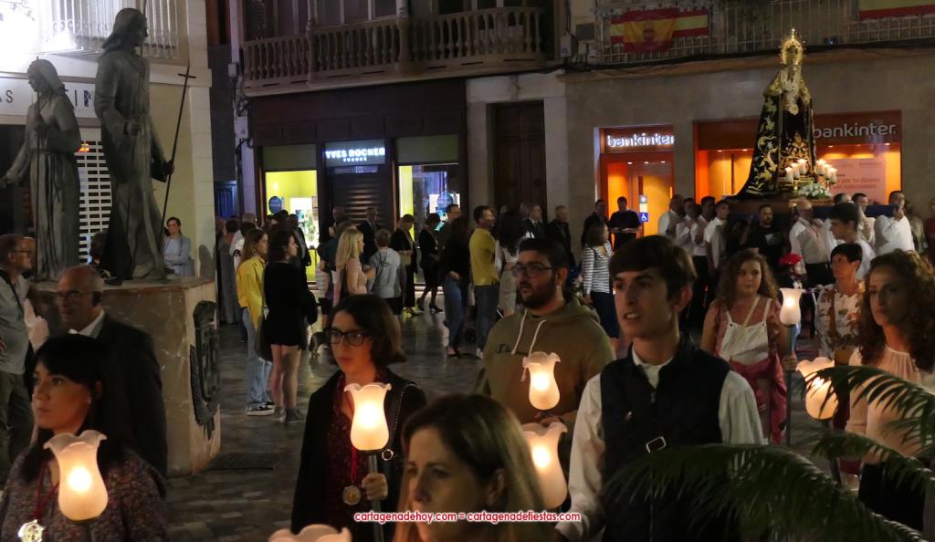 Este año hemos recuperado la normalidad y los desfiles regresaron en Semana Santa y en otras fechas en plenitud, pero resulta que hasta hace sólo un año la situación era distinta. Quizás porque la memoria es selectiva, para muchos parece que la crisis pandémica fue hace tiempo, pero en absoluto, sólo ha pasado un año desde que Cartagena volvió a ver a una imagen salir en procesión, lo que no sucedía desde el año 2019. El virus sigue ahí, pero ahora estamos mucho más preparados para rechazarlo, con lo que anoche todo estuvo centrado en acompañar a la Virgen del Rosario, lo que hicieron numerosas personas de dispares edades, abriendo paso la cruz y el tercio de hachotes con velas encendidas en una marcha en la que Francisco de la Cerra fue el encargado de ir dando lectura al rosario.