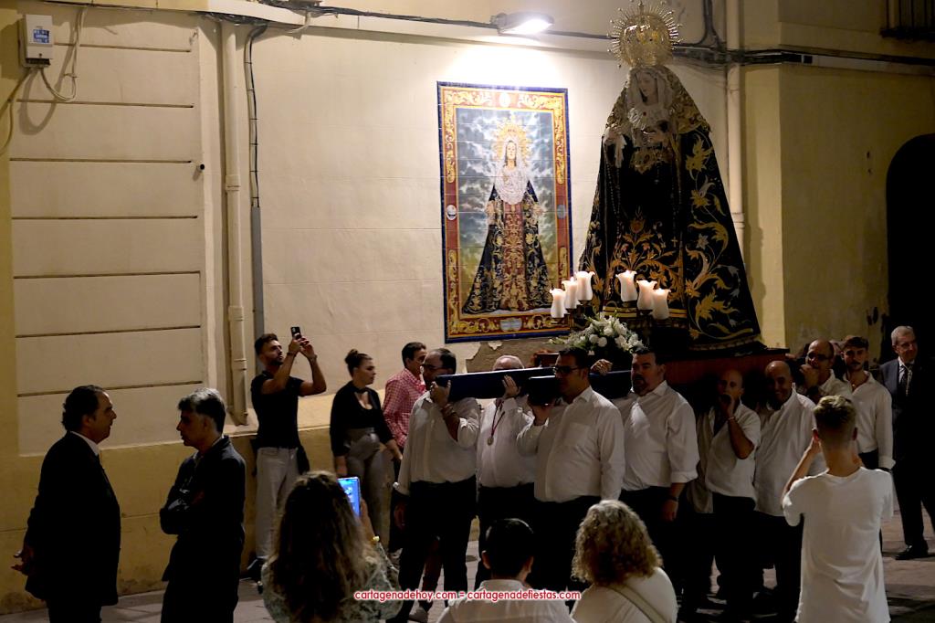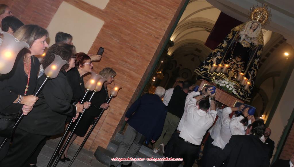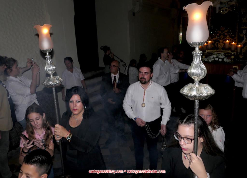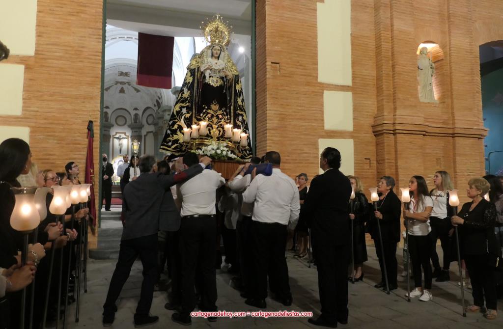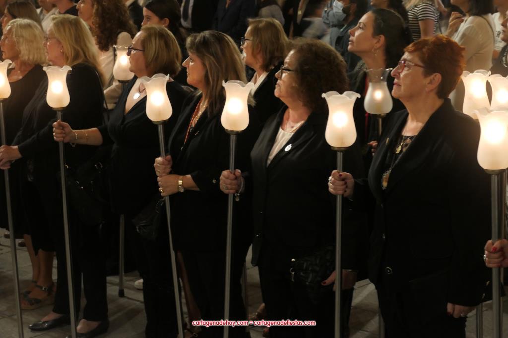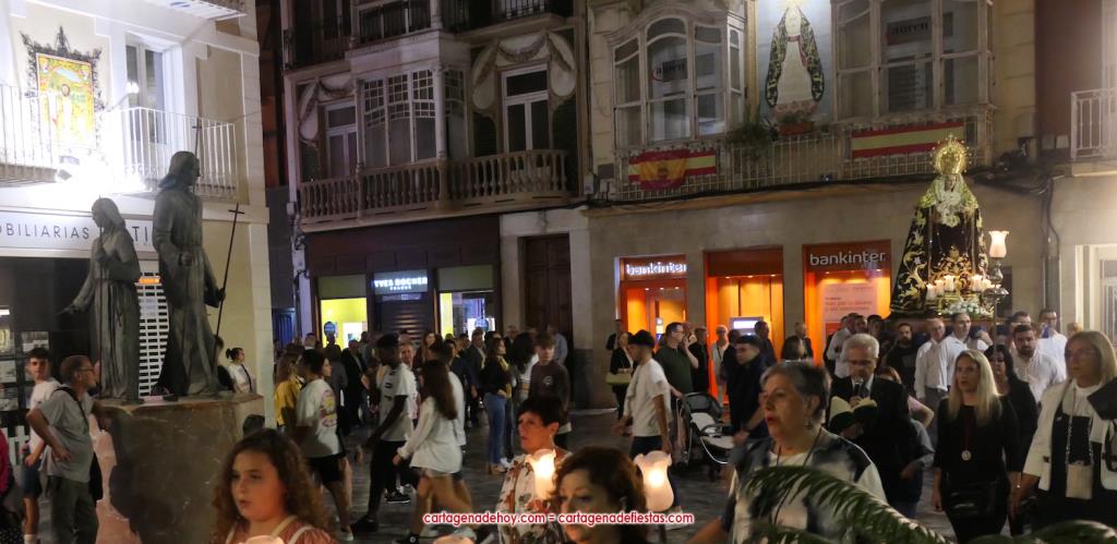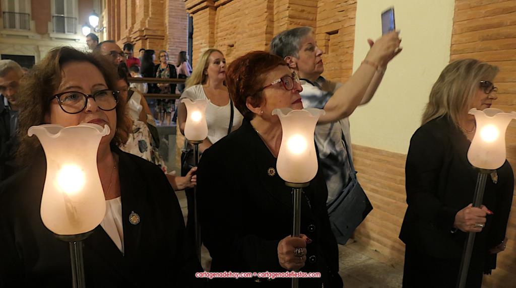 María Santísima del Rosario salió anoche por el entorno de Santa María arropada por un numeroso número de fieles y por las llamas de los hachotes al igual que hizo en octubre de 2021, cuando se convirtió en la primera imagen que desfilaba por Cartagena tras la crisis pandémica. GALERÍA DE FOTOS (pinchar aquí)