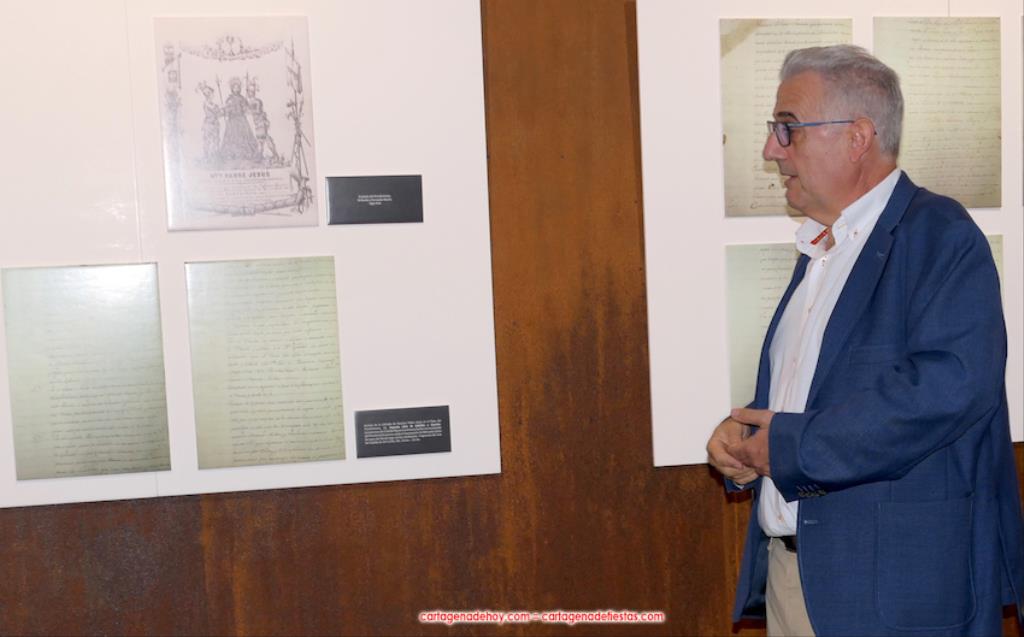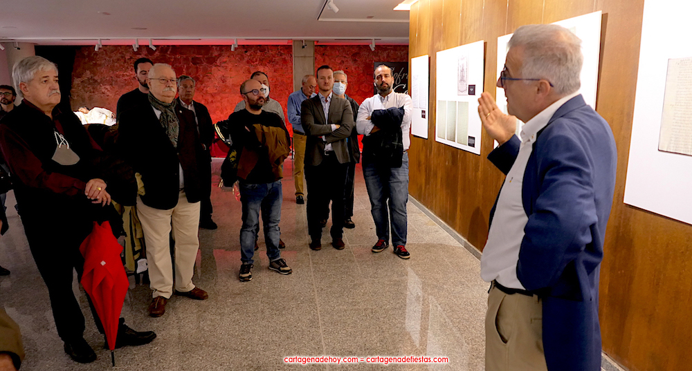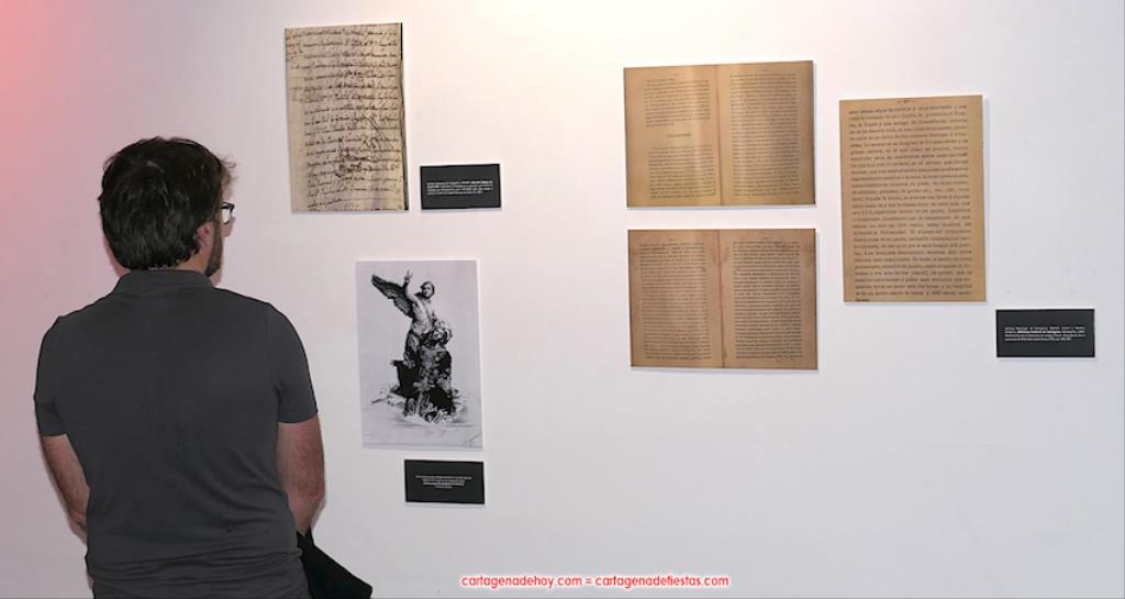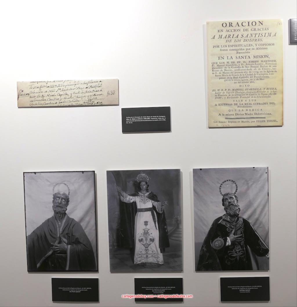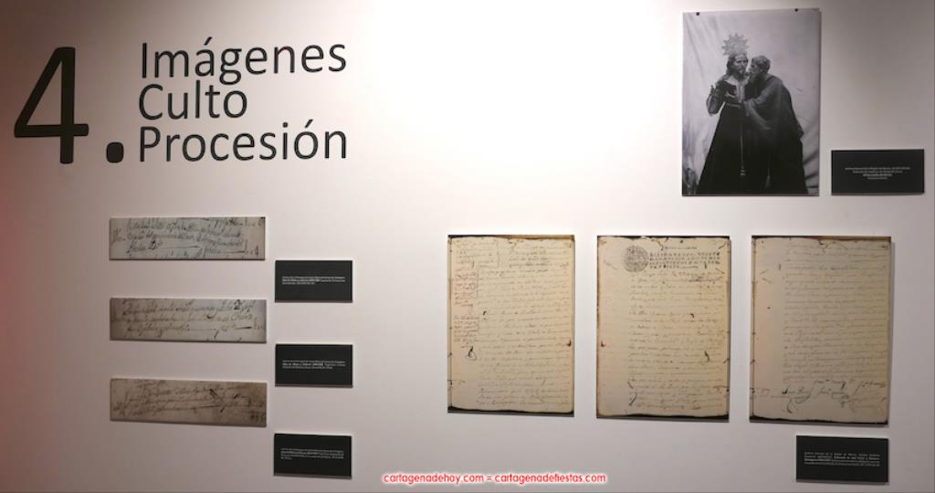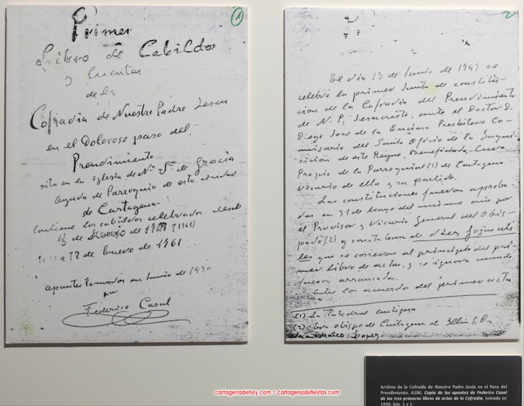 Todo lo que se muestra lleva su placa que explica su contenido, pudiéndose observa, entre otros, las notas de Federico Casal sobre la asamblea fundacional y el escrito remitido en ese décimo octavo siglo al Conde de Aranda, quien llevó a cabo una encuesta sobre las cofradías que entonces había en España y para qué servían. Los cartageneros del Prendimiento le expusieron que sus finalidades eran pedir para la conversión de los que están en pecado mortal, pedir para el culto de Jesús del Prendimiento y sacar la procesión ("entonces costaba 18.000 reales, una cantidad muy elevada", apuntó Del Baño Zapata) y, en tercer lugar, estar comprometido cada hermano y cada hermana ("así se recoge") en poner un real por cada persona que muere para pagar su entierro y misa. El conde consideró que la hermandad debía seguir con los objetivos prioritarios del primer y tercer fundamento expuestos.