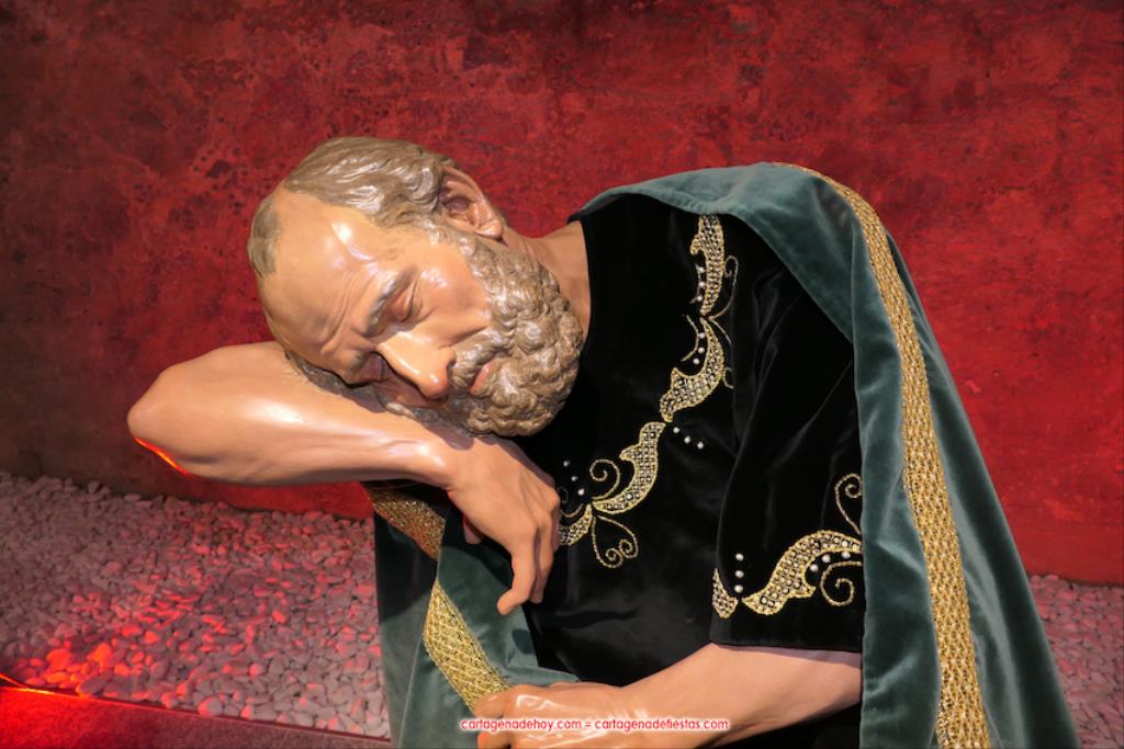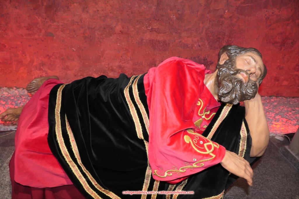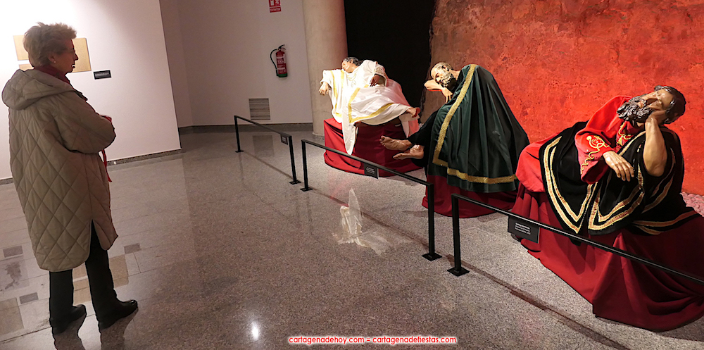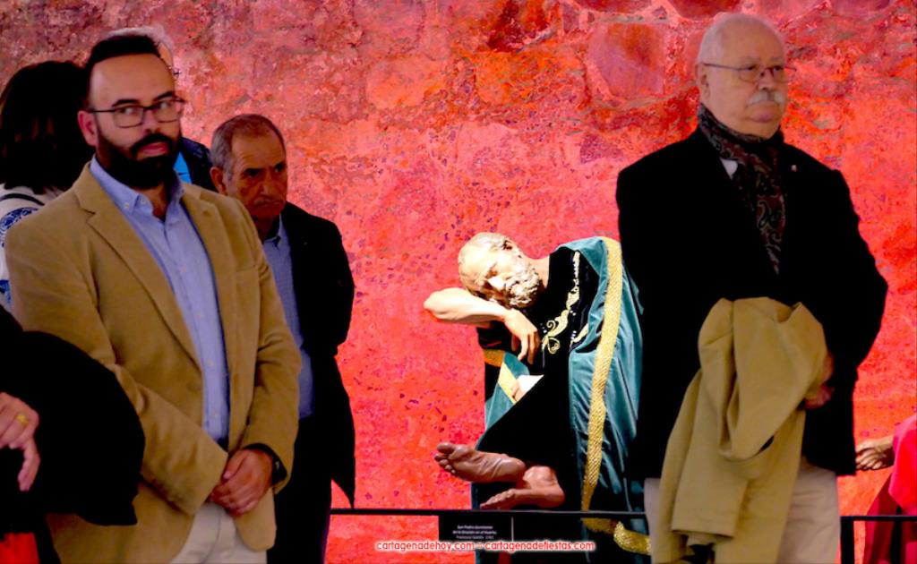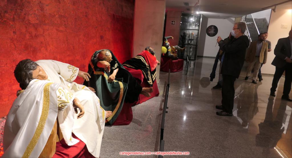 La exposición 'Letras de oro' ('Litterae Aureae' en latín) se basa en ese patrimonio documental que se ha conseguido reunir para tener lo más completo posible en la hermandad lo que fueron sus primeras huellas desde la constitución de 1747 y el posterior estreno en procesión de los hermanos vestidos de rojo encarnado, como recoge uno de esos escritos. La muestra, que acoge la sala 'Dora Catarineu' de la calle Ronda de la ciudad (muy cerca del Mercado de Santa Florentina), se completa con la posibilidad de ver de cerca los detalles de "las joyas escultóricas" (como las definieron anoche) que quedan de la obra del artista murciano con esta cofradía en el siglo XVIII: los tres apóstoles durmientes (Juan, Pedro y Santiago) del grupo de la 'Oración del huerto' y el sayón romano del grupo del 'Ósculo', lo cuales se salvaron de ser destruidos al estallar el conflicto bélico al encontrarse en el almacén de Villa Pilatos. Las tallas que fueron destruidas se pueden ver a través de fotografías en esta exposición.