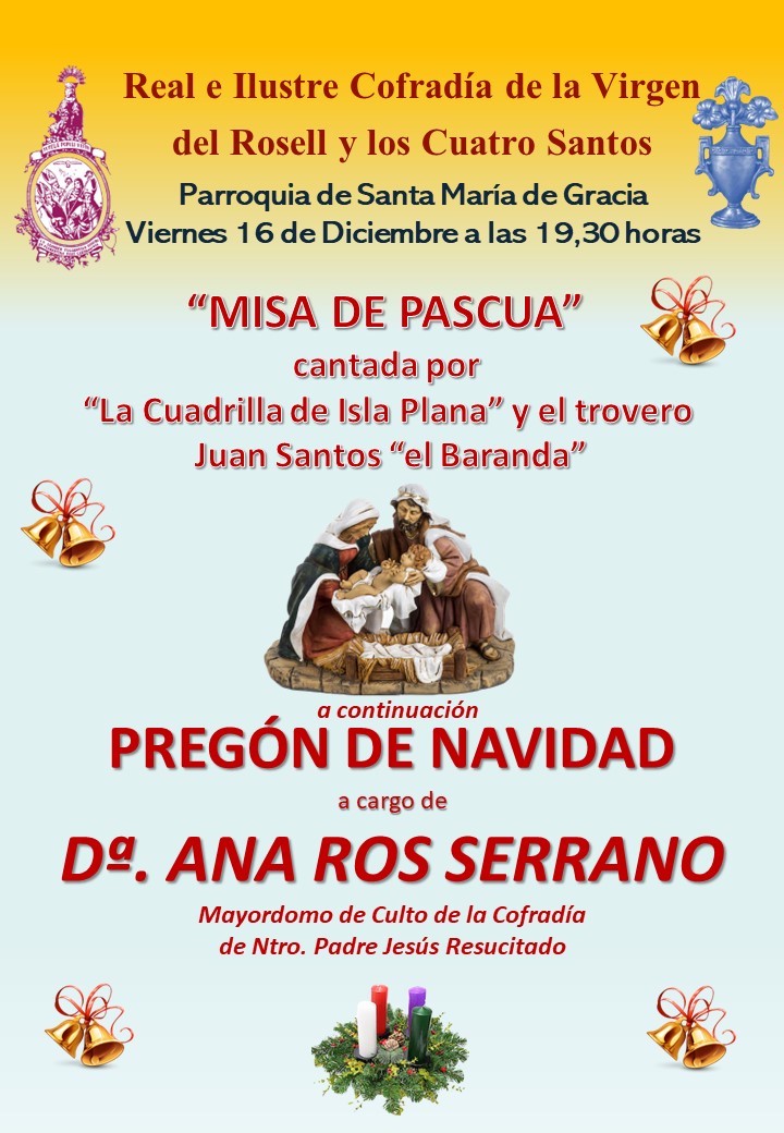 La parroquia de Santa María de Gracia será el marco en el que el 16 de diciembre, a las 19.30 horas, tenga lugar la ‘Misa de Pascua’ cantada por la cuadrilla de Isla Plana y el trovero Juan Santos ‘El Baranda’, siendo a su conclusión cuando la mayordomo de culto de la hermandad procesionista del Resucitado lleve a cabo anuncio de las entrañables fechas de final de este año.