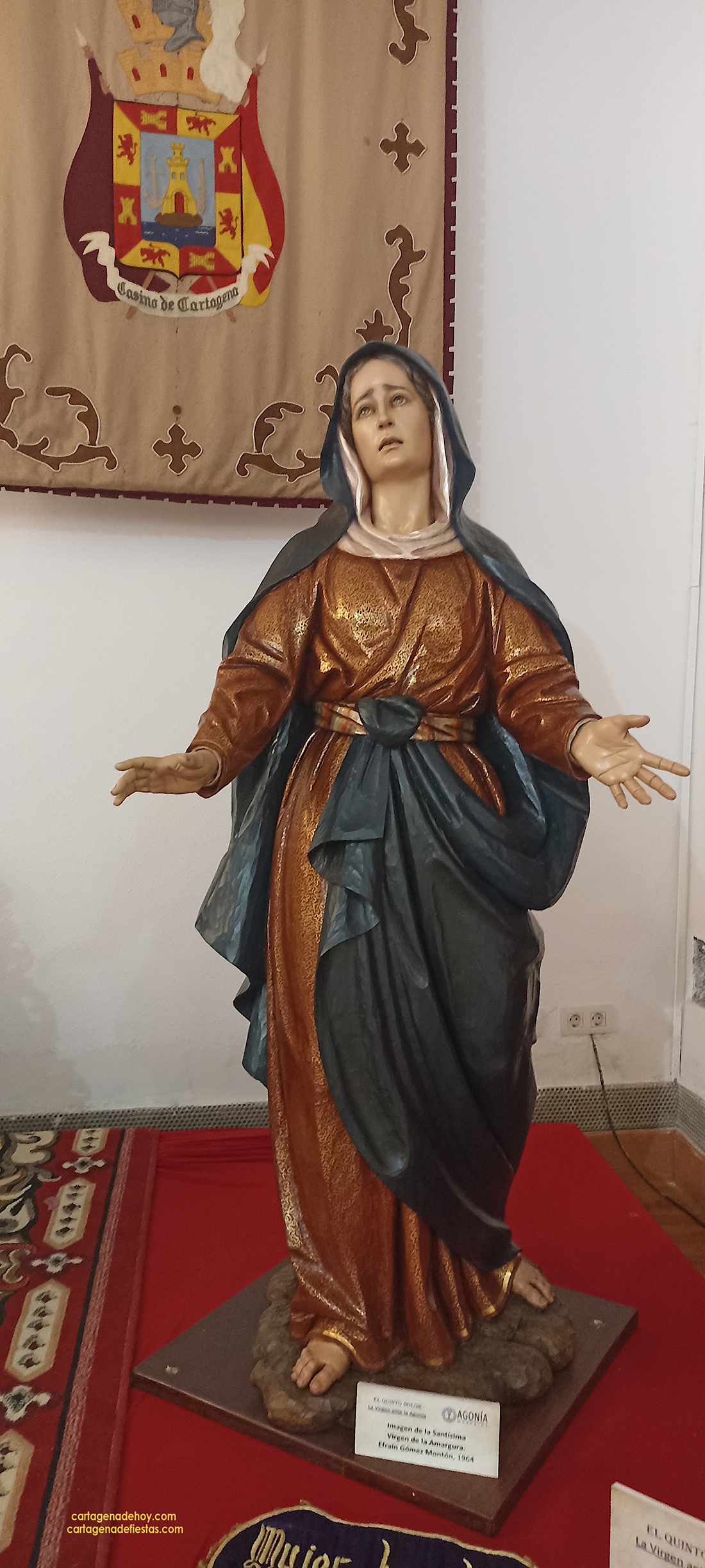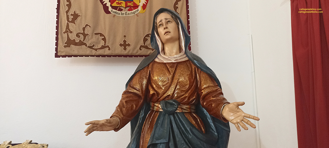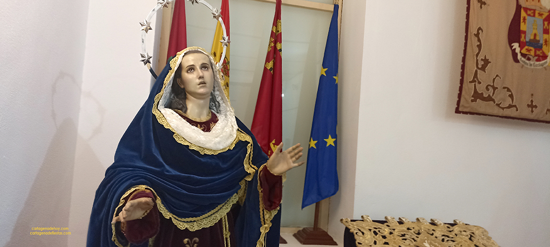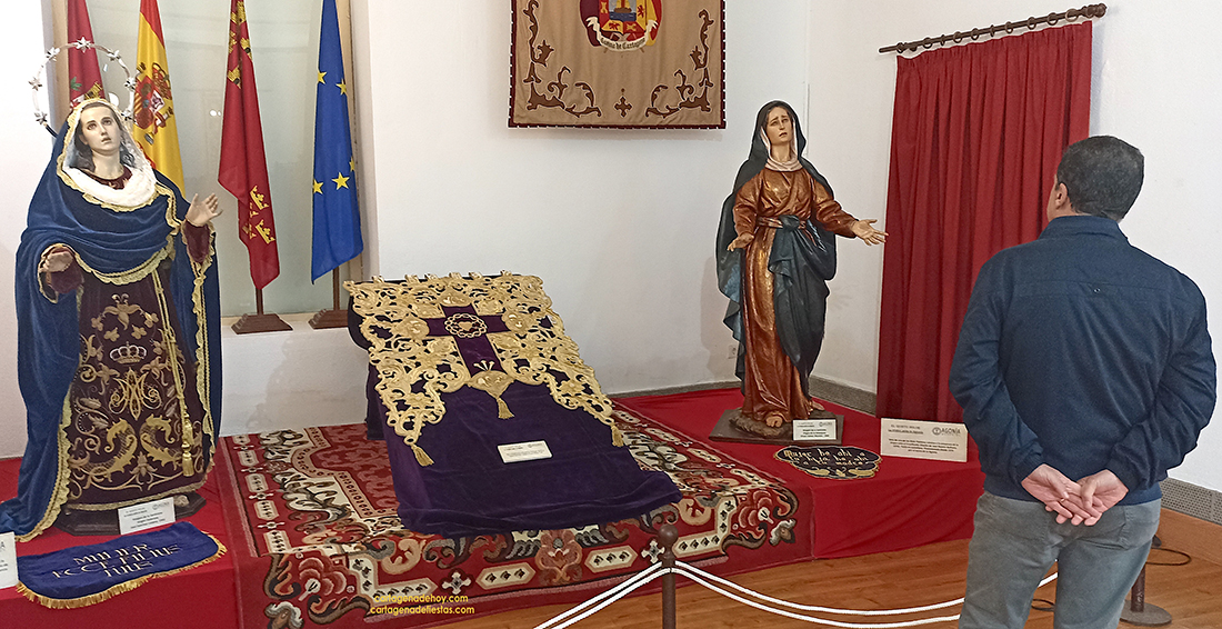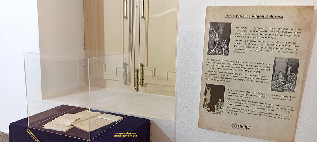 ‘Jesús es crucificado frente a su Madre’. Contemplar su agonía y muerte genera el sentimiento de dolor de una madre ante el sufrimiento de su hijo. Sobre este suceso gira la exposición de la agrupación marraja de la Santa Agonía que acoge el Casino de Cartagena con la imagen recién restaurada de la Virgen de la Armagura y de quien ocupó ese lugar en el trono del Viernes Santo hasta su llegada y que era conocida como ‘la Virgen guapa’.
