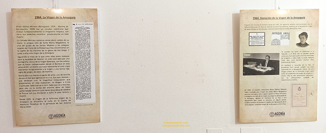 La muestra permite ver a ambas tallas de cerca, siendo especial la motivación en el caso de la Virgen de la Amargura, pues sale de un proceso de restauración llevado a cabo por Ana Sierra (contratada ants de pasar a la nómina de la Cofradía Marraja), como la acumulación de policromías en diversas partes del cuerpo y, entre otras situaciones, que un dedo de la mano derecha no era el original. También había fisuras en la túnica. Otras actuaciones fueron la limpiza general y la eliminación de hongos. Este ‘rejuvencimiento’ de la imagen se ha llevado en dos fases, facilitando que la imagen saliese en procesión en la Semana Santa de 2022. Cabe recordar que la agrupación que preside Agustín Peragón también acometió durante esta época pandémica la restauración del Cristo de la Agonía.