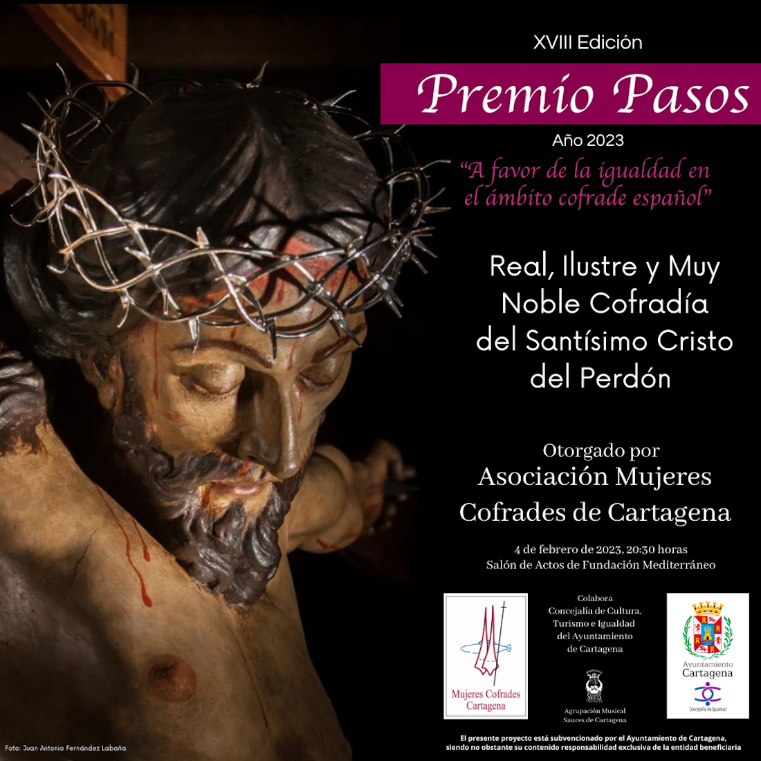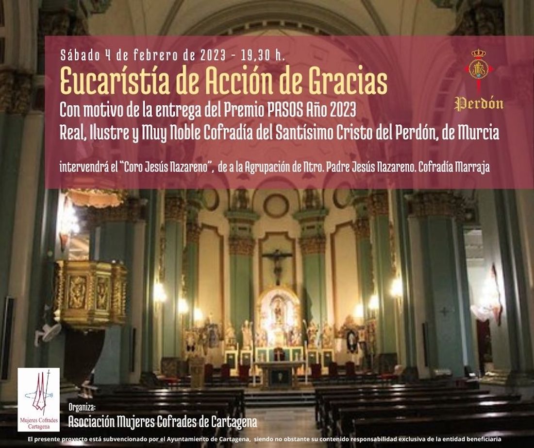 La Asociación Mujeres Cofrades de Cartagena celebra este sábado su misa de acción de gracias en la iglesia de Santa María (19.30 horas), para una hora más tarde llevar a cabo en la Fundación Mediterráneo la entrega de la XVIII edición del galardón destinado a colectivos procesionistas por su labor de trabajar por la plena integración de la mujer en la Semana Santa, que, en esta ocasión será recogido por la Real, Muy Noble e Ilustre Cofradía del Santísimo Cristo del Perdón de la ciudad de Murcia.