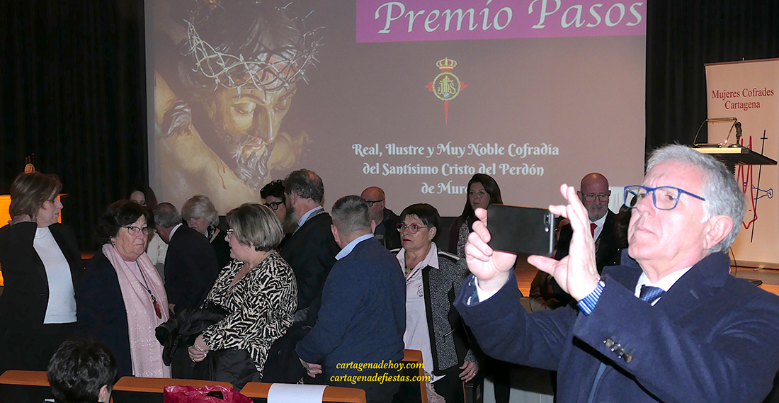 En la gran pantalla se fueron sucediendo varias proyecciones, como el vídeo promocional de la Semana Santa de Cartagena gestado por la empresa ‘Cartagena Cofrade’, la historia del premio Pasos, la relación de aspirantes al galardón y el reportaje audiovisual centrado en la Real, Ilustra y Muy Noble Cofradía del Santísimo Cristo del Perdón de Murcia, ganadora de la edición número 18 y en el que las féminas entraron en sus filas de penitentes en 1909 y en su junta directiva en 1983, teniendo gran protagonismo, como también refleja son estas procesionistas las que llevan las redes sociales y la revistas de la hermandad del Perdón.
