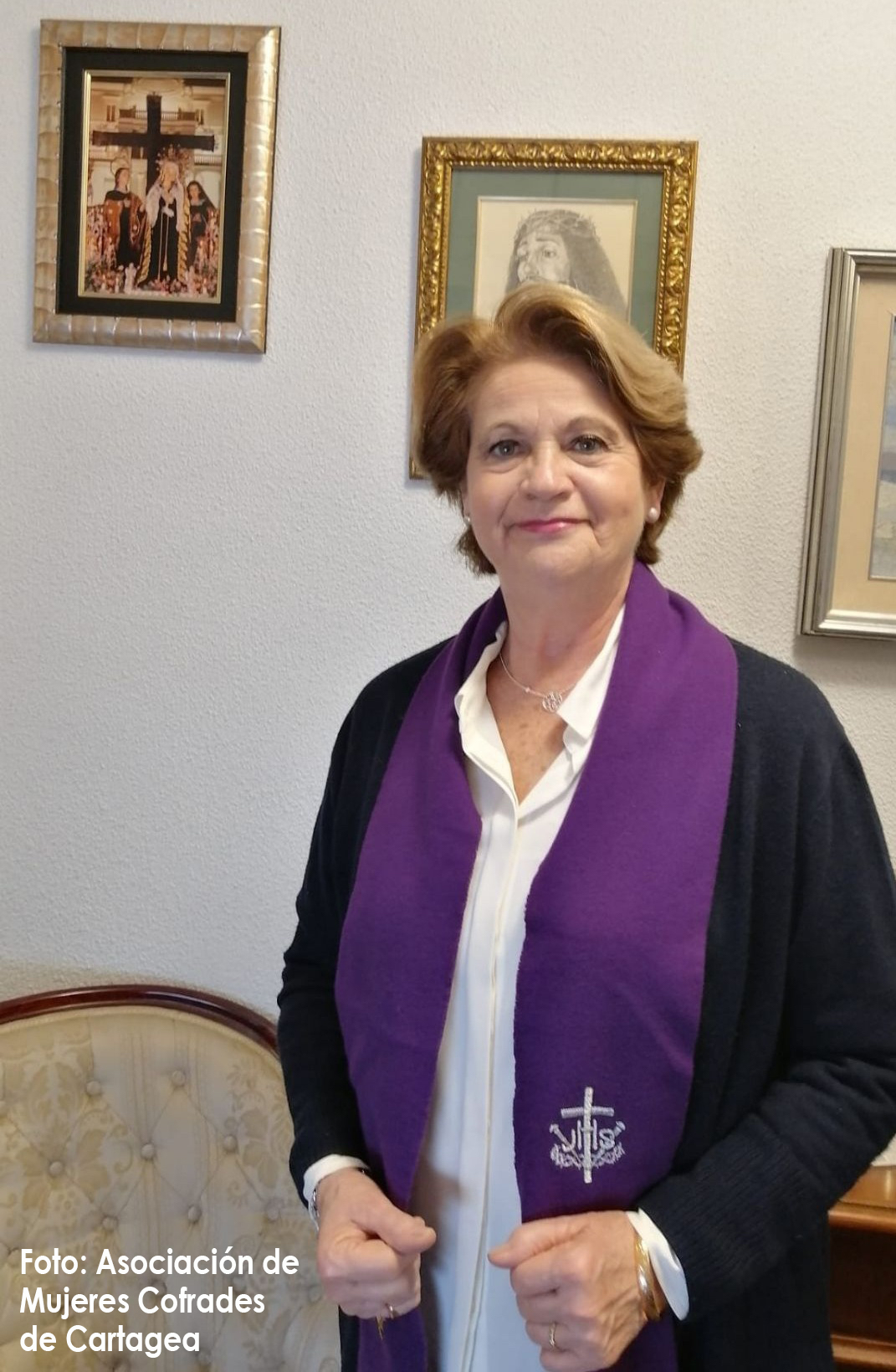 Fundadora del grupo de damas portapasos de las Santa Mujeres del Sábado Santo, comisaria general de la Cofradía del Nazareno desde hace más de tres décadas, vocal de la Asociación de Mujeres Cofrades y muy vinculada a la Asociación Piadosa de Nuestro Padre Jesús de Medinaceli, ha sido elegida por la Junta de Cofradías para la principal distinción femenina de la Semana Santa de Cartagena.
