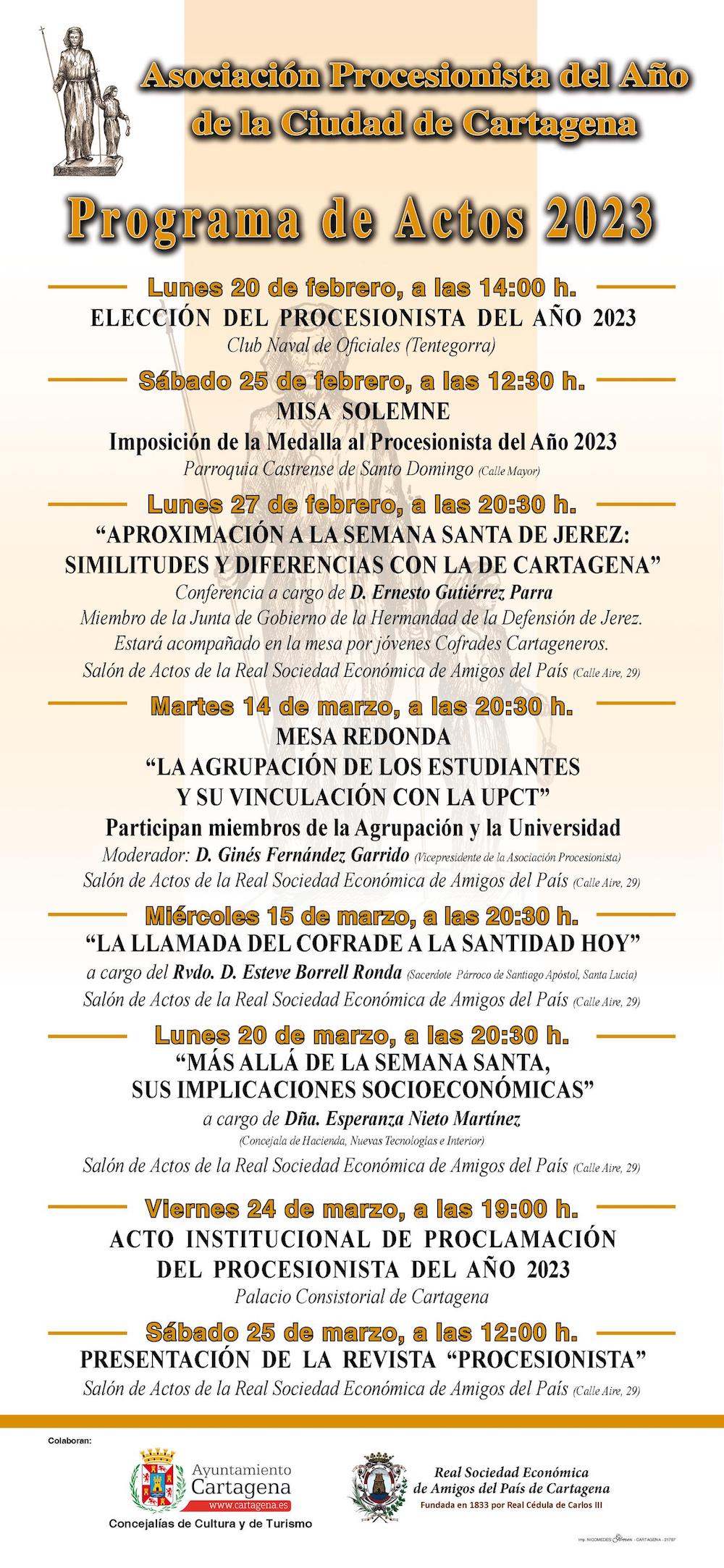 El programa de actos comenzará este próximo lunes con la elección del cofrade sobre el que recaerá el galardón este 2023 y al que se impondrá la medalla el sábado siguiente, mientras que el 24 de marzo será el día del acto institucional de su proclamación. Por otro lado, los conferenciantes serán Ernesto Gutiérrez, Ginés Fernández Garrido, Esteve Borrell y Esperanza Nieto. El cierre llegará el 25 del próximo mes con la presentación de la revista de este colectivo.