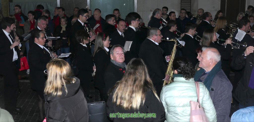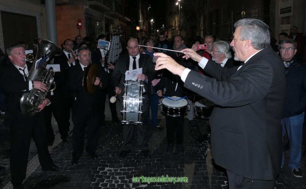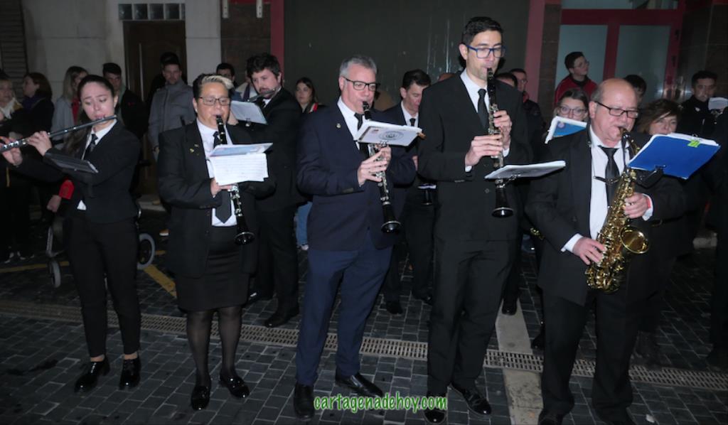 La marcha desde el Palacio Consistorial fue encabezada por la Agrupación 'Cartagena 1990' con el sonido de las piezas procesionistas musicales más alegres. Abrían paso a la alcaldesa, a los cuatro hermanos mayores, a la pregonera, al procesionista del año y a la nazarena mayor junto a una amplia representación de la familia cofrade, pudiéndose observar las bufandas de diferentes colores según la hermandad (morado, encarnado, blanco y negro), además de una 'cuatricolor' que representa a todas ellas y que ya está totalmente arraigada estos días.