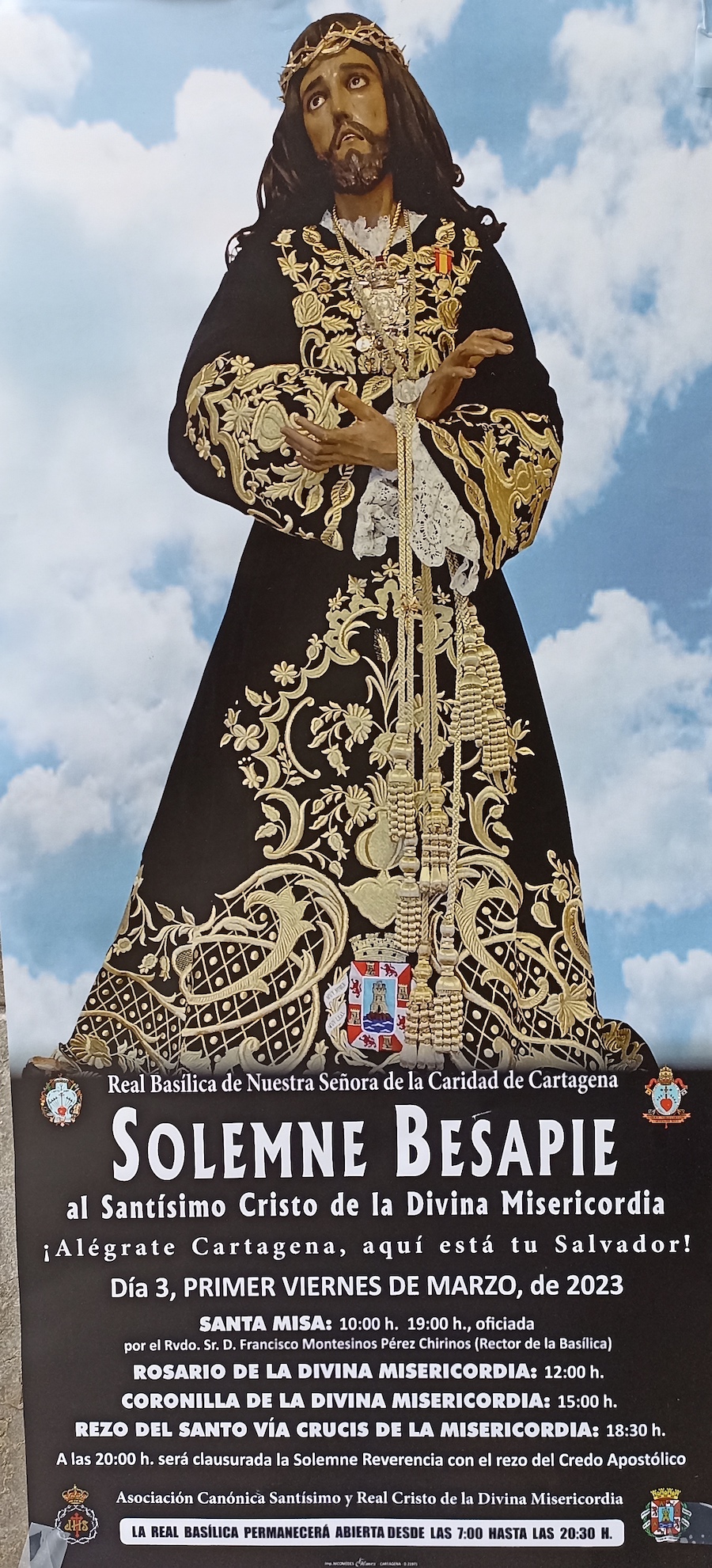 La Real Basílica Menor de la Virgen de la Caridad de Cartagena acoge este viernes el tradicional en honor a la imagne del Cristo de la Divina Misericordia, que organiza la asociación canónica que lleva su nombre. La iglesia estará abierta de 7 a 20.30 horas. Habrá misas a las 10 y 19 horas.