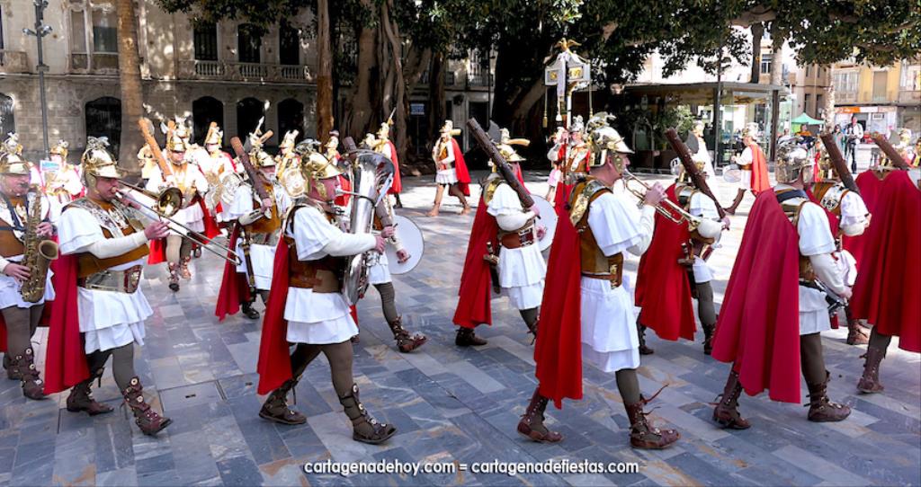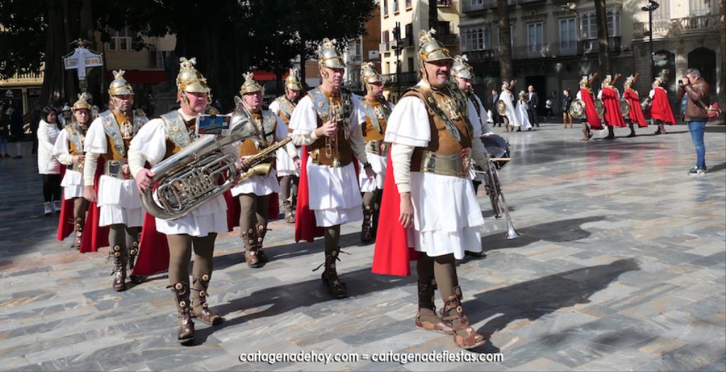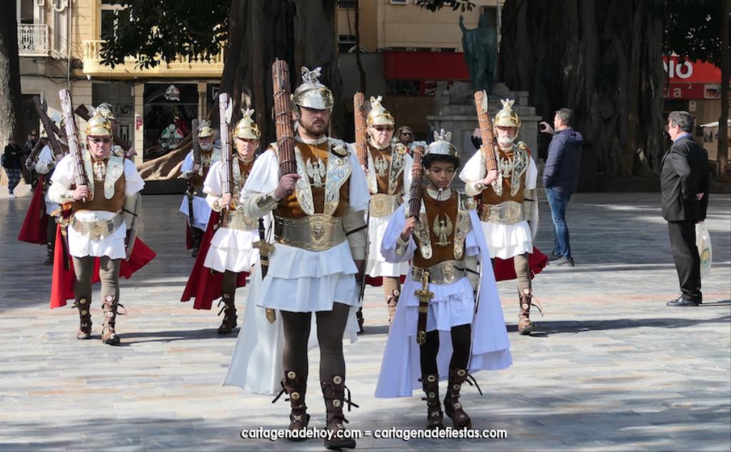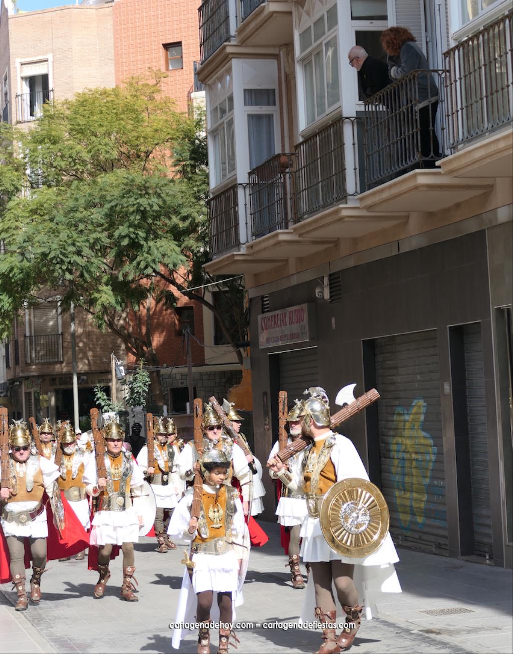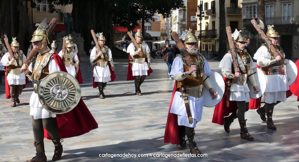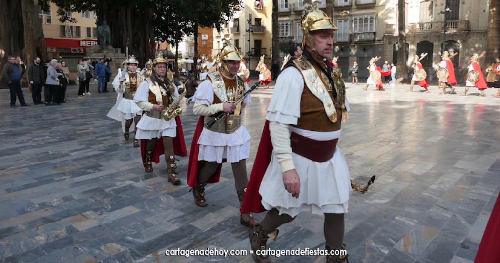 La Semana Santa de Cartagena tiene entre sus tradiciones que los soldados romanos y los granaderos de las cofradías salgan a la calle los domingos previos para anunciar la inmediatez de la procesiones. Los primeros en salir son los Soldados Romanos de la hermandad de Jesús Resucitado, siendo ayer el día elegido en este 2023. Había ilusión por volver a cruzar la ciudad con desfiles y ‘caracoles’, pero el inicio no fue el esperado, pues la salida se tuvo que retrasar por el paso por el casco antiguo de la media maratón y luego hubo problemas para tener el pórtico del templo de la patrona abierto, ya que la basílica está en obras y con el retraso ya había comenzado la misa en la capilla anexa. La cuestión es que ha final todo se solventó y se recuperó la normalidad, con ofrenda floral a la Virgen de la Caridad y posterior visita al asilo de ancianos del Barrio de la Concepción, además de la habitual foto en las escaleras del Palacio Consistorial con su atuendo identificativo de túnica blanca, peto marrón, capa rojo y el singular dragón en el casco.