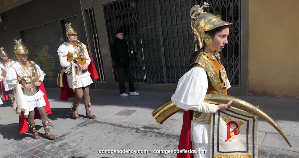 Entre las novedades de este pasacalles figura María Mínguez, quien desde el pasado mes de noviembre es la presidenta de la gestora de los romanos blancos, y que tres hermanos llevasen, a fina de la formación, una bandera roja sobre la que viandantes depositaban monedas y billetes. “Es la petitoria, que era muy habitual en los pasacalles de cuaresma hace varias décadas con el objetivo de recoger fondos para ayudar a las agrupaciones en sus gastos. Hemos decidido recuperar esta tradición, pues en su día lo habitual es que la petitoria cerrase al grupo”, explicaba a Cartagena de Hoy la hermana mayor de la cofradía, Marién García Boj.