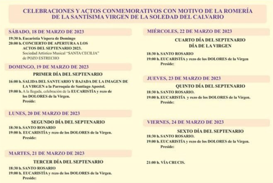 La semana de la Virgen empezará el sábado, 18 de marzo, con un concierto de apertura a los Actos del Septenario 2023. El domingo, 19 de marzo, se realizarán a las 16:00 horas la salida del santuario y la bajada de la imagen de la Virgen a la Parroquia de Santiago Apóstol.