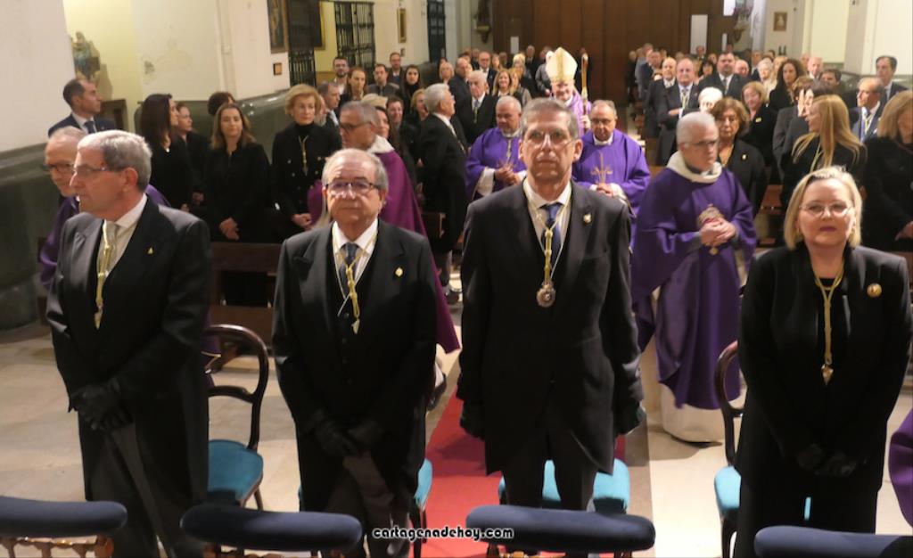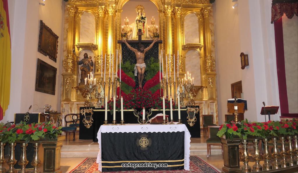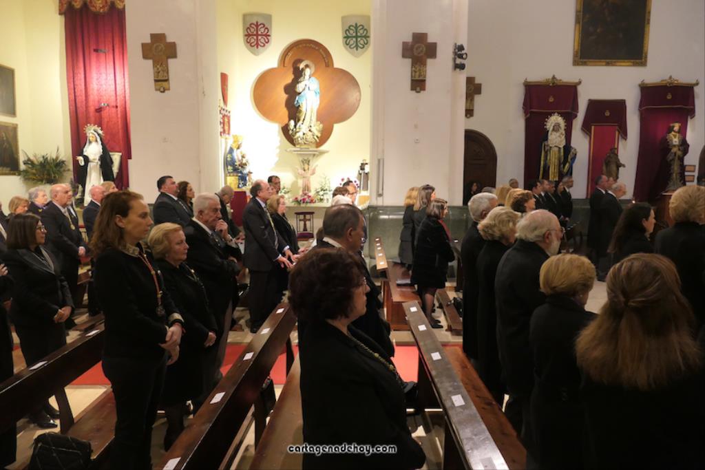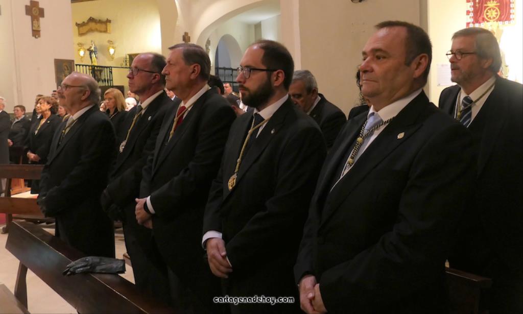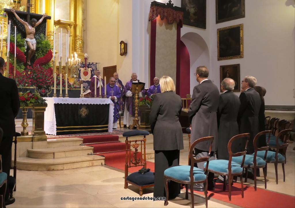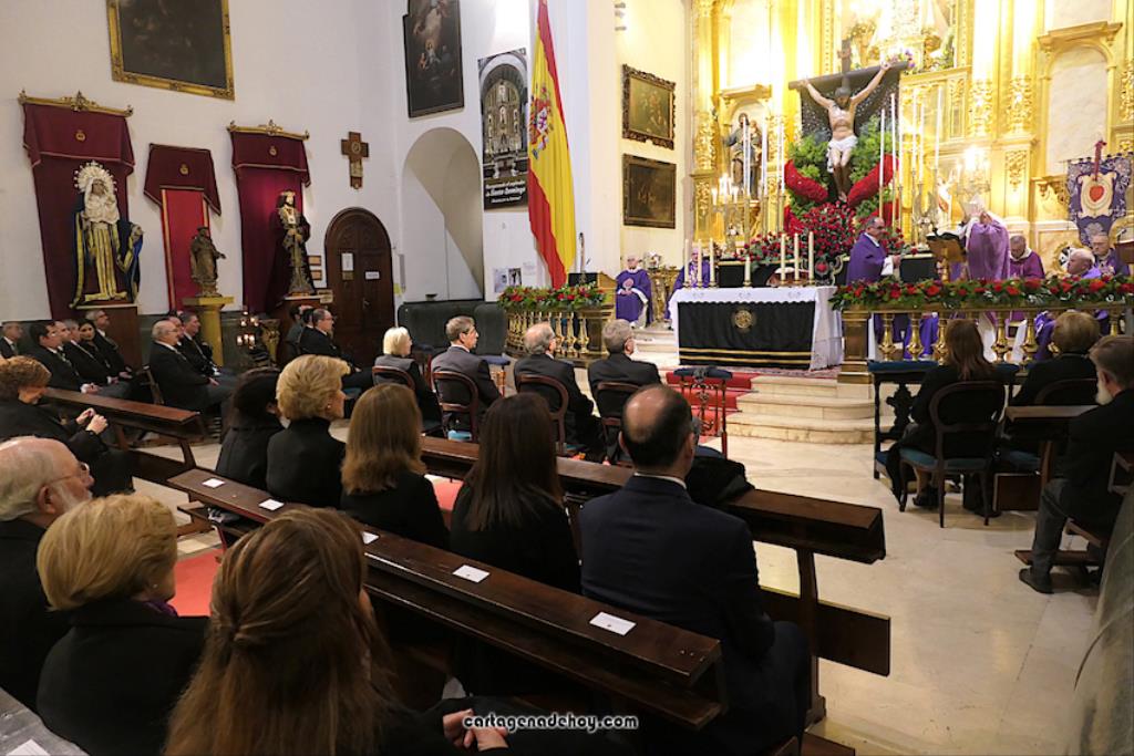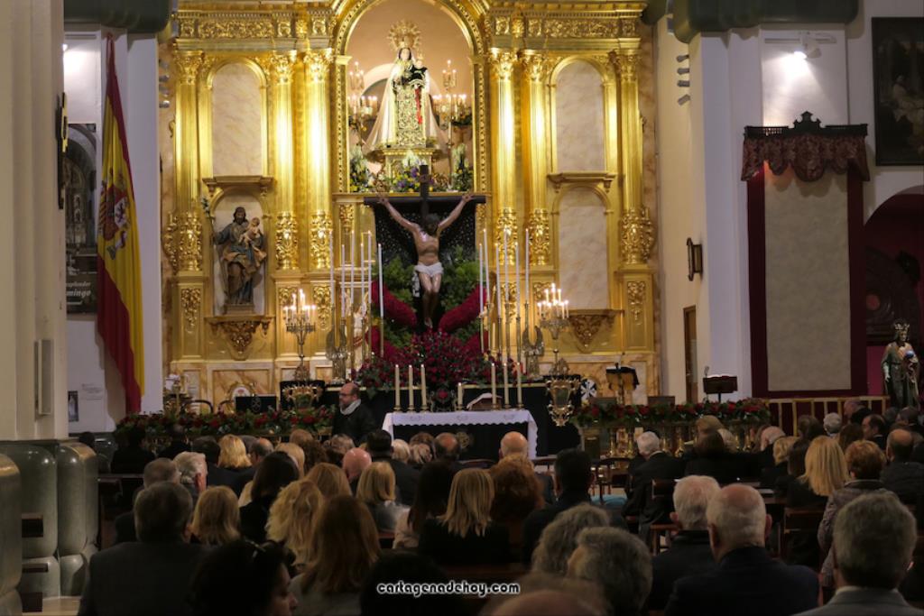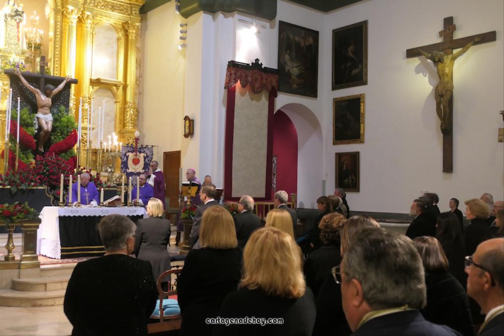 La tercera gran cita eucarística de cuaresma de las hermandades pasionarias de Cartagena ha tenido como protagonista a la Real e Ilustre Cofradía del Cristo del Socorro en la iglesia de Santo Domingo, donde el crucificado ha estado situado delante del nuevo retablo sobre una base de flores rojas, en un bonito adorno creado por José Manuel López Vilar, actual vicesecretario general y responsable de orneto de la cofradía que crearon 33 caballeros en 1691.