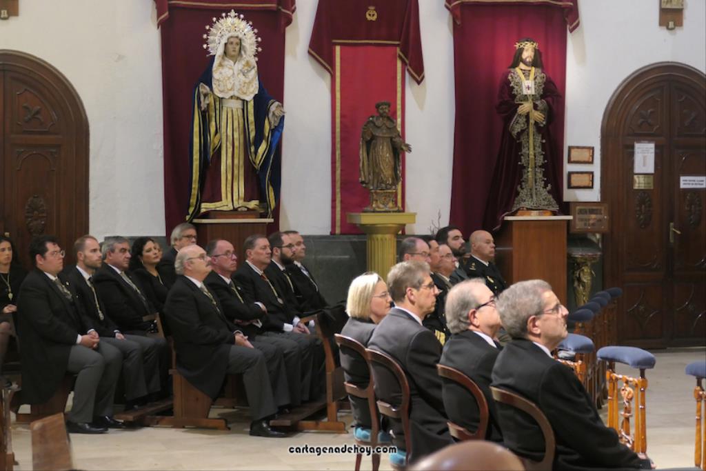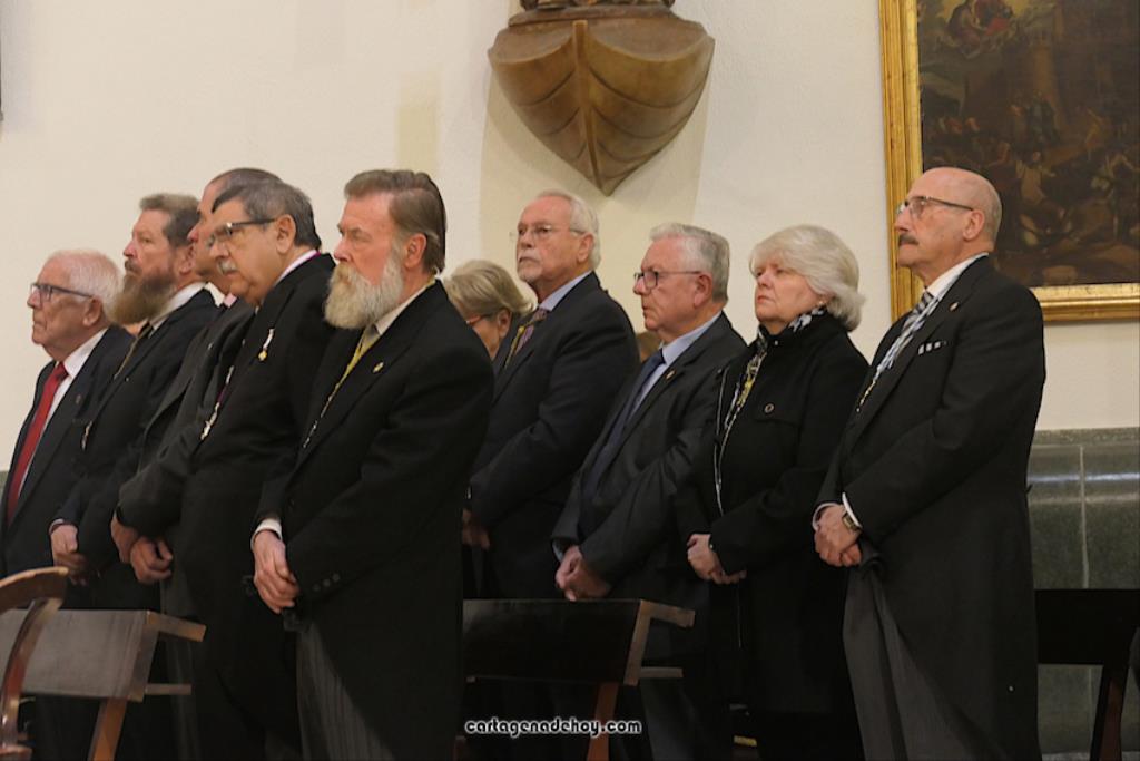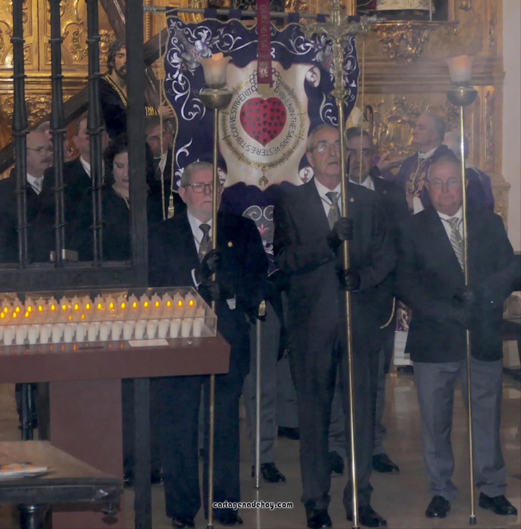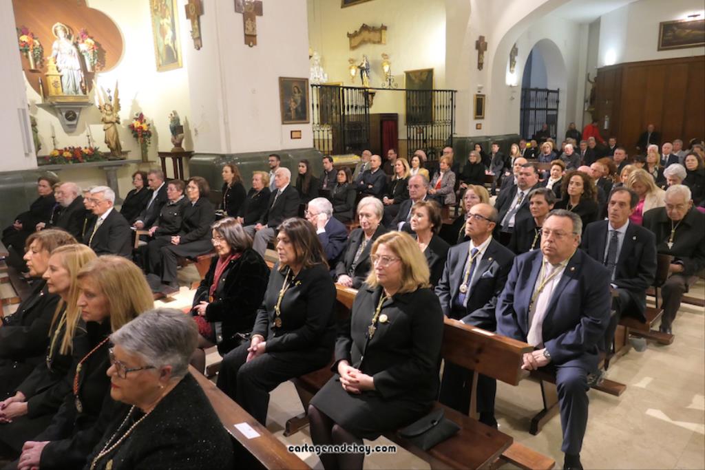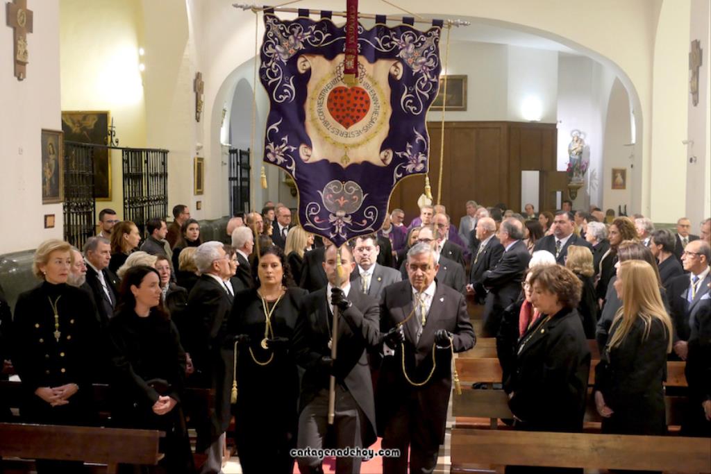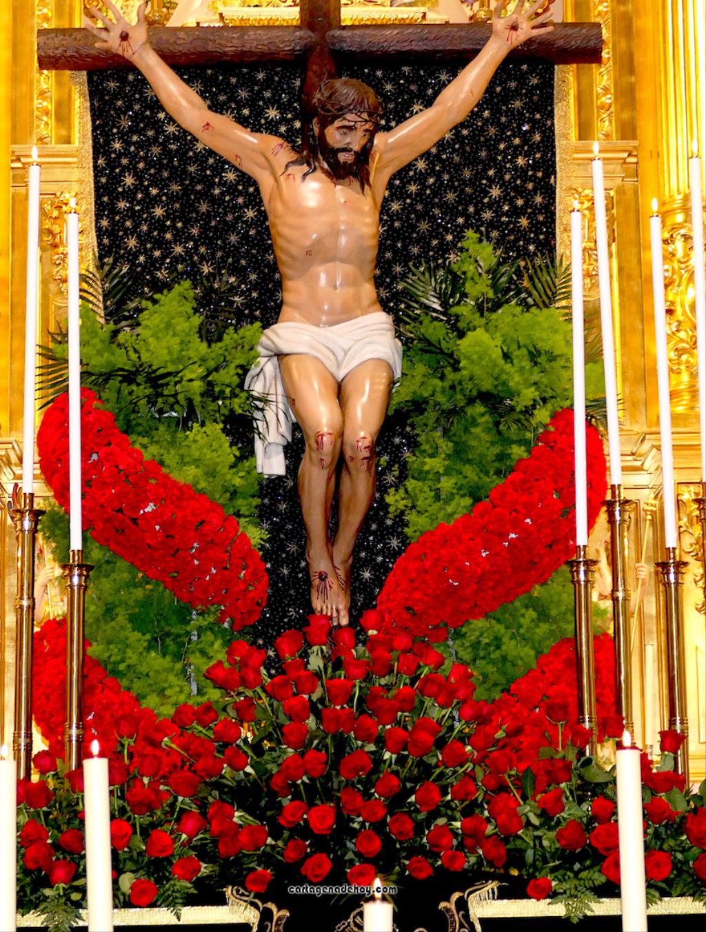 La tercera gran cita eucarística de cuaresma de las hermandades pasionarias de Cartagena ha tenido como protagonista a la Real e Ilustre Cofradía del Cristo del Socorro en la iglesia de Santo Domingo, donde el crucificado ha estado situado delante del nuevo retablo sobre una base de flores rojas, en un bonito adorno creado por José Manuel López Vilar, actual vicesecretario general y responsable de orneto de la cofradía que crearon 33 caballeros en 1691.