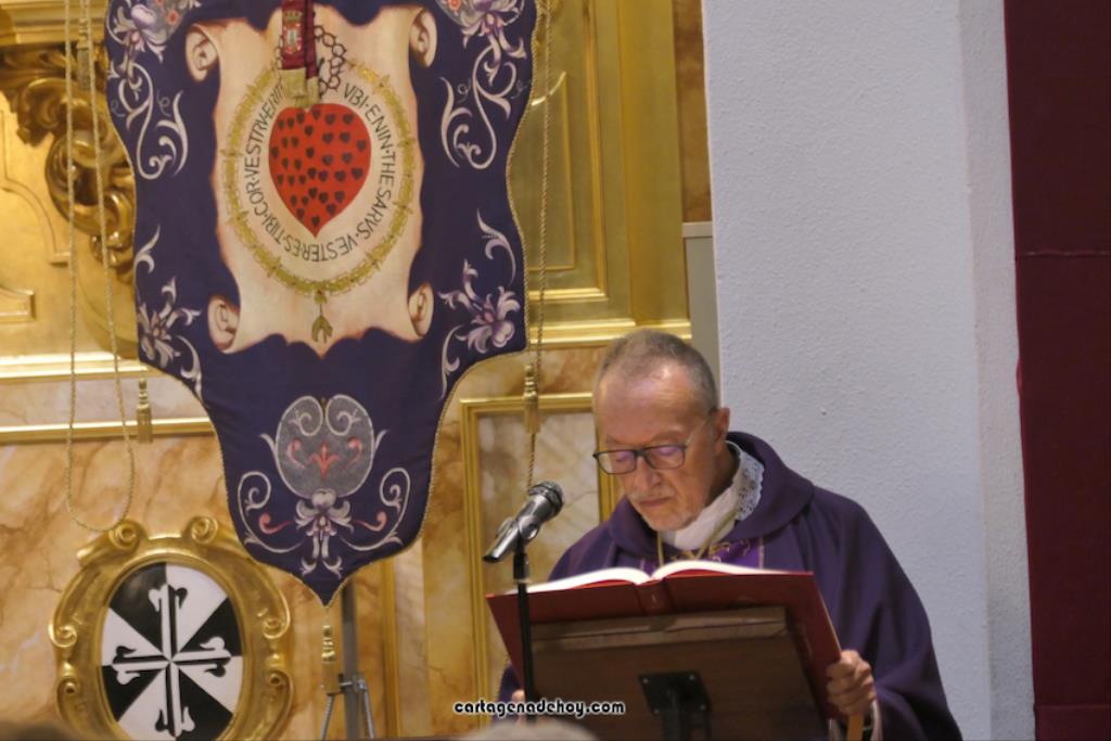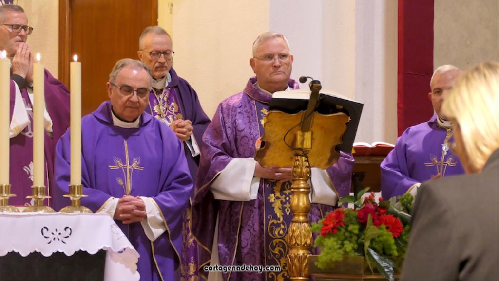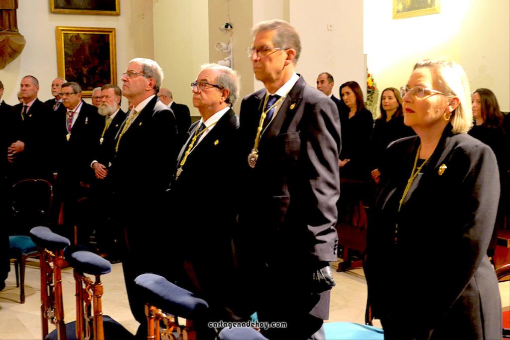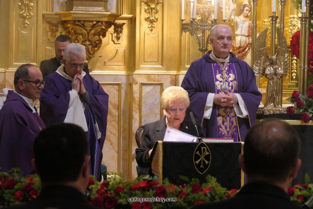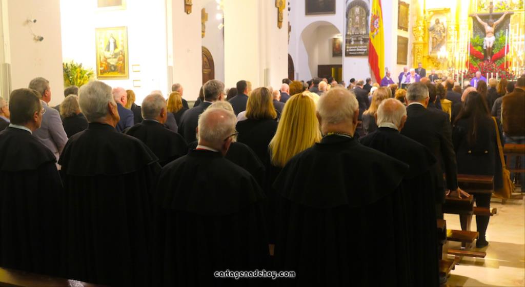 Con el apoyo sonoro de la coral Tomás Luis de Victoria, se ha pedido en la misa por la paz mundial, por la situación de la comunidad ucraniana y por salir totalmente de la pandemia, entre otras peticiones, siendo el capítulo de la palabra representado en teatro leído por los capellanas de las cofradías del Socorro (Lázaro Gomariz), marraja (Fernando Gutiérrez) y california (Francisco de Asís Pagán), que han relatado los últimos días de Jesús de Nazaret, desde el juicio, la condena, la crucifixión, su sufrimiento, el despojamiento y el sepelio en el sepulcro.