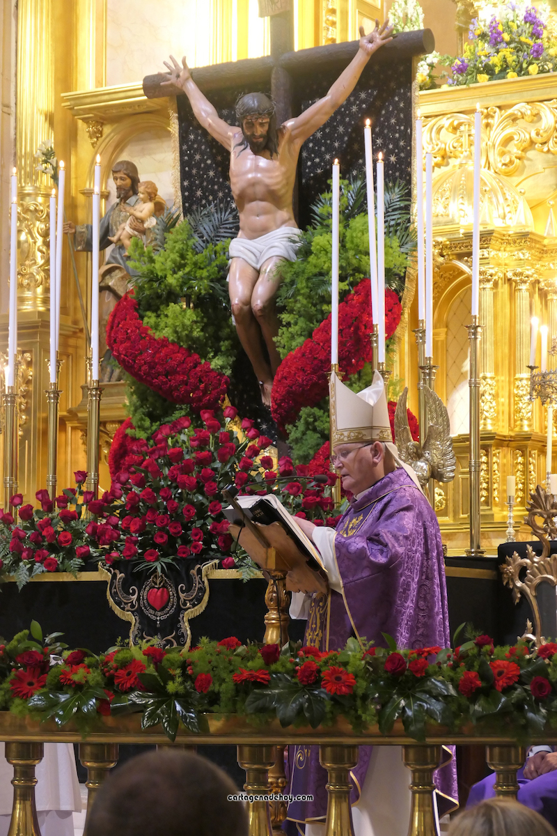 Después, el obispo de la Diócesis de Cartagena, monseñor Lorca Planas, ha llevado a cabo la homilia, que ha comenzado diciendo que la Semana Santa “no pasa de moda, pues no son sólo unos días”, sino que todo el año alberga en el corazón de la persona”, para a continuación referirse en Jesús como referencia de vida. “Es el modelo de ser un cristiano que defiende siempre la verdad (…) Verlo en la cruz inspira. He aquí al hombre”, ha dicho, enlazando con los escritos de San Pablo que indicaban que, como humano, Jesús se humilló a sí mismo “obedeciendo hasta la muerte en la cruz; se despojó de sí mismo (…) Asumió una naturaleza humana hasta el sufrimiento (…) No se bajó de la cruz, aunque pudo haberlo hecho”, remarcando “el misterio de la quinosis de Cristo”.
